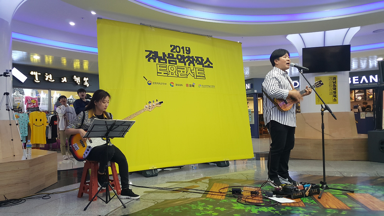 지난 4월 27일 오후 4시, 진주 에나몰 중앙광장에서 특별한 공연이 열렸다. 공연 이름은 '2019 경남 음악창작소 토요콘서트(이하 '토요콘서트')'. 토요콘서트는 문화체육관광부와 경상남도, 김해시와 경남문화예술진흥원이 주최·주관한 주말 문화 행사로 이번엔 김해 5팀, 진주 4팀, 창원 5팀 등 도합 14팀 뮤지션들이 참여해 경남 대중들에게 음악의 여유를 선물했다.
