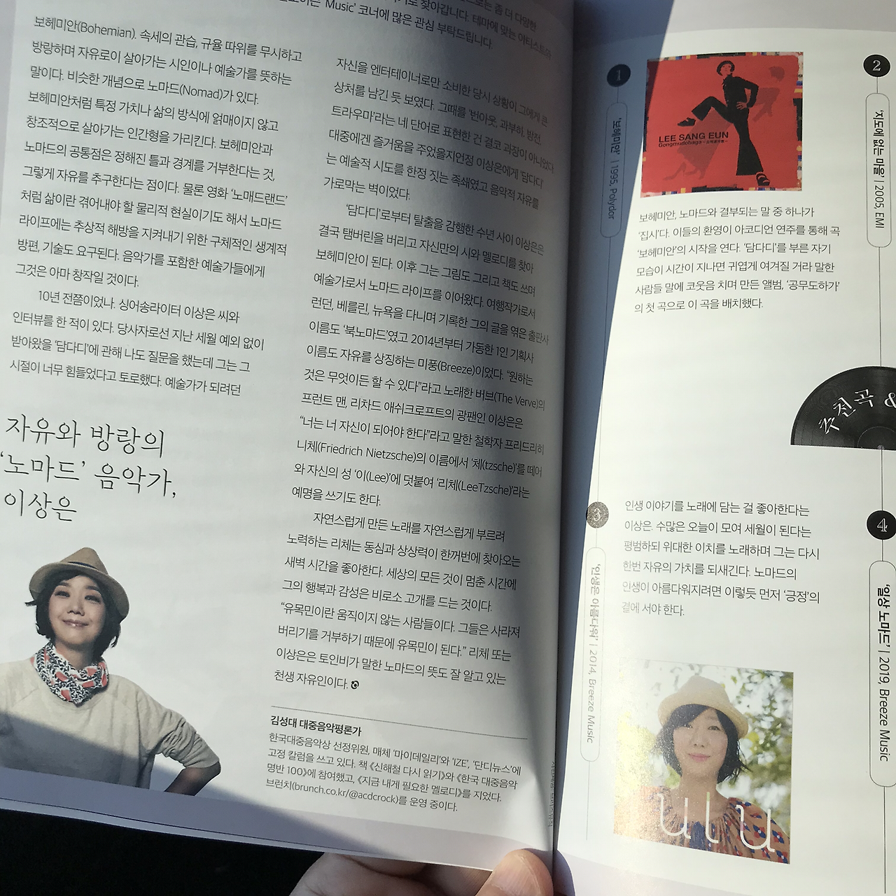 인생 이야기를 노래에 담는 걸 좋아한다는 이상은. 수많은 오늘이 모여 세월이 된다는 평범하되 위대한 이치를 노래하며 그는 다시 한번 자유의 가치를 되새긴다. 노마드의 인생이 아름다우려면 이렇듯 먼저 ‘긍정’의 곁에 서야 한다.