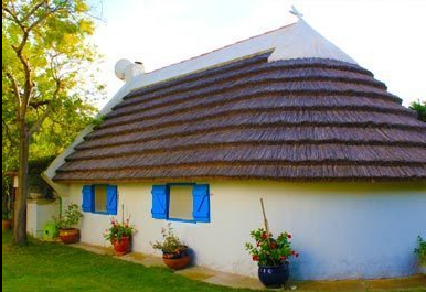 낮은 벽이 있고 서까래가 가로지르는 큰 지붕을 가지고 있으며,