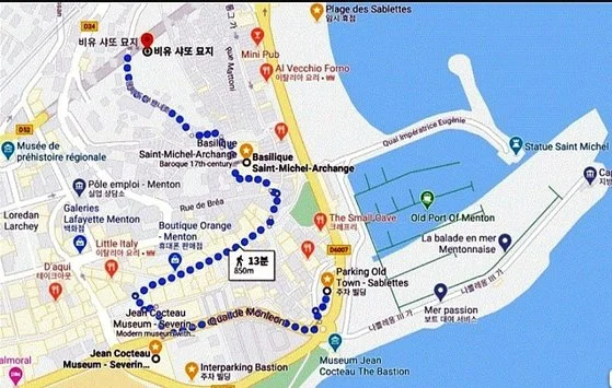 망통을 사랑한 장 콕토 뮤지엄을 보고, 그 부근의 아름다운 바닷가도 거닐어 보고 길을 건너 성당(Basilique Saint-Michel-Archange)을 보고, 더 올라가서 묘지( Cimetière du Vieux Château )에서 망통 조망을 하면 된다. 장 콕토 뮤지엄 가까이 주차장이 있다. 시인, 극작가, 소설가, 화가, 영화감독 등 다양한 삶을 산 장 콕토가 만든 미술관으로 그의 작품 2000점과 유품이 소장되어 있다. 17세기 요새를 장 콕토가 직접 보수했다고 한다. “내 귀는 소라 껍질, 바닷소리를 그리워한다….” 이 시를 쓴 사람이 장 콕토이다.