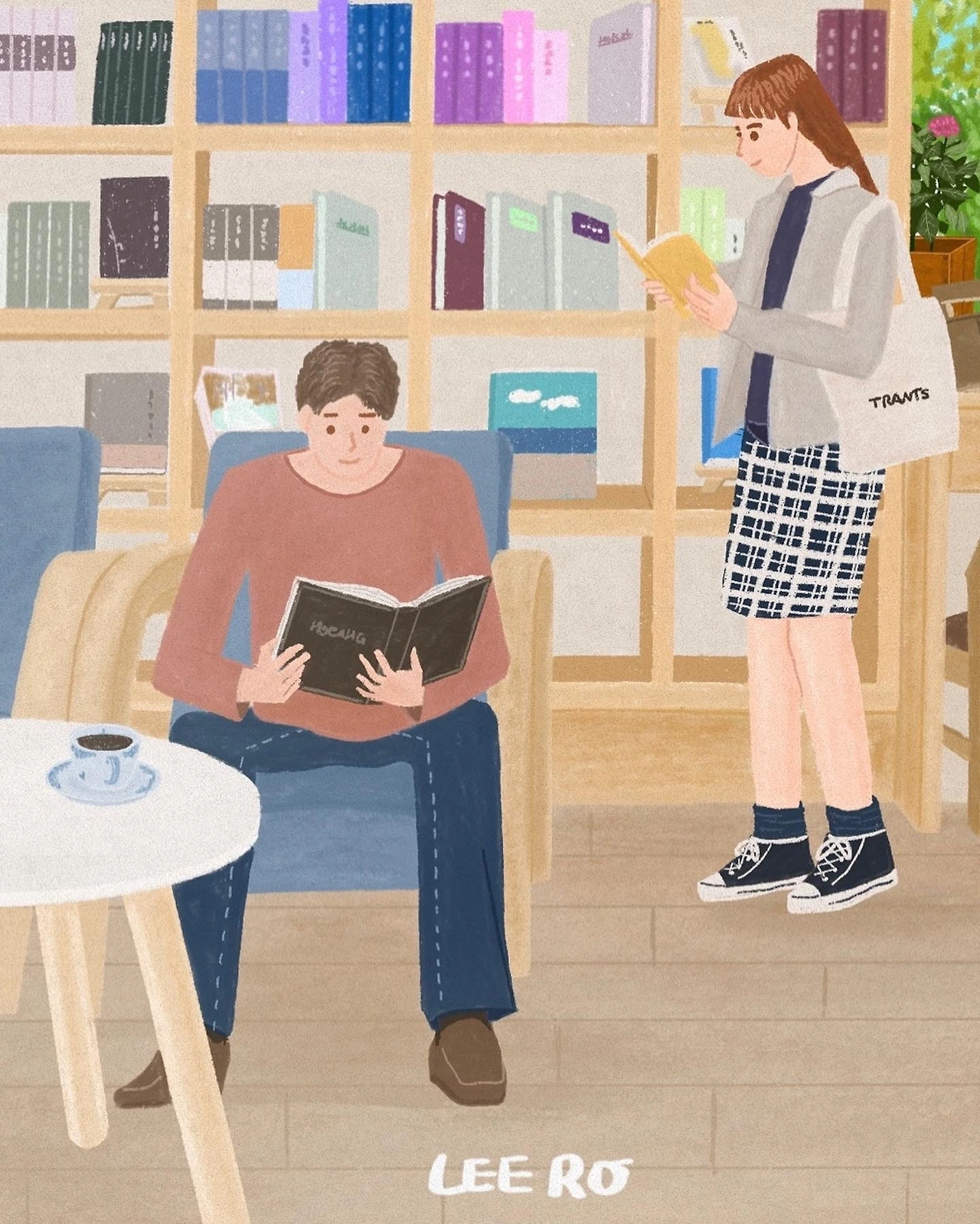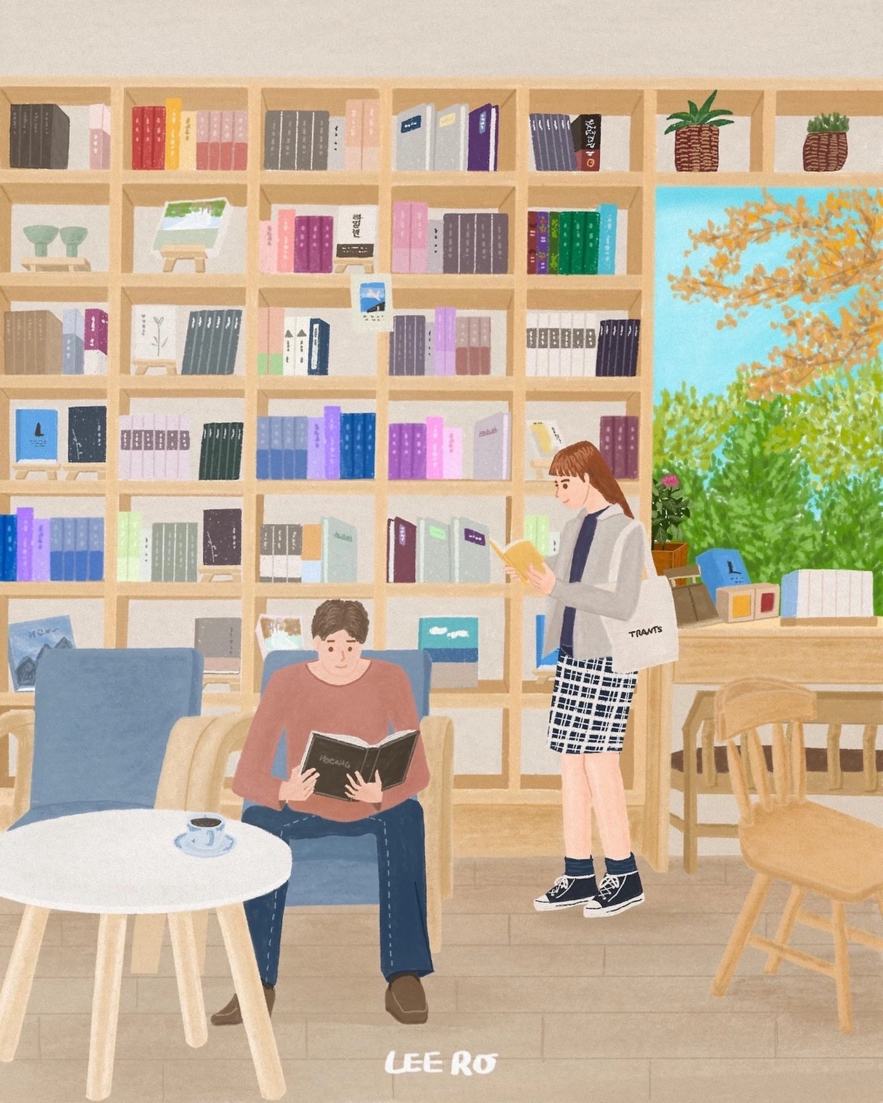 평소 책장이있는 일러스트를 그리고싶었는데요. 마침 봄길책방에서 찍은 사진이 있어 참고해서 그려봤어요 따스한 기운이 가득한곳에서 여유있게 독서하는 사람. 제가 그려보는 행복한 순간입니다