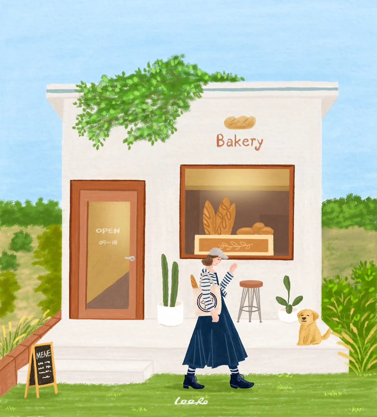 이번엔 빵집에 들러 바게트 사러가는 사람을 그려봤어요 ㅎㅎ 도시보다 자연과 함께있는 빵집이 좋을거같다는 생각에 그리게되었어요 내일 주말이니 오전에 브런치로 바게트를 ㅎㅎ