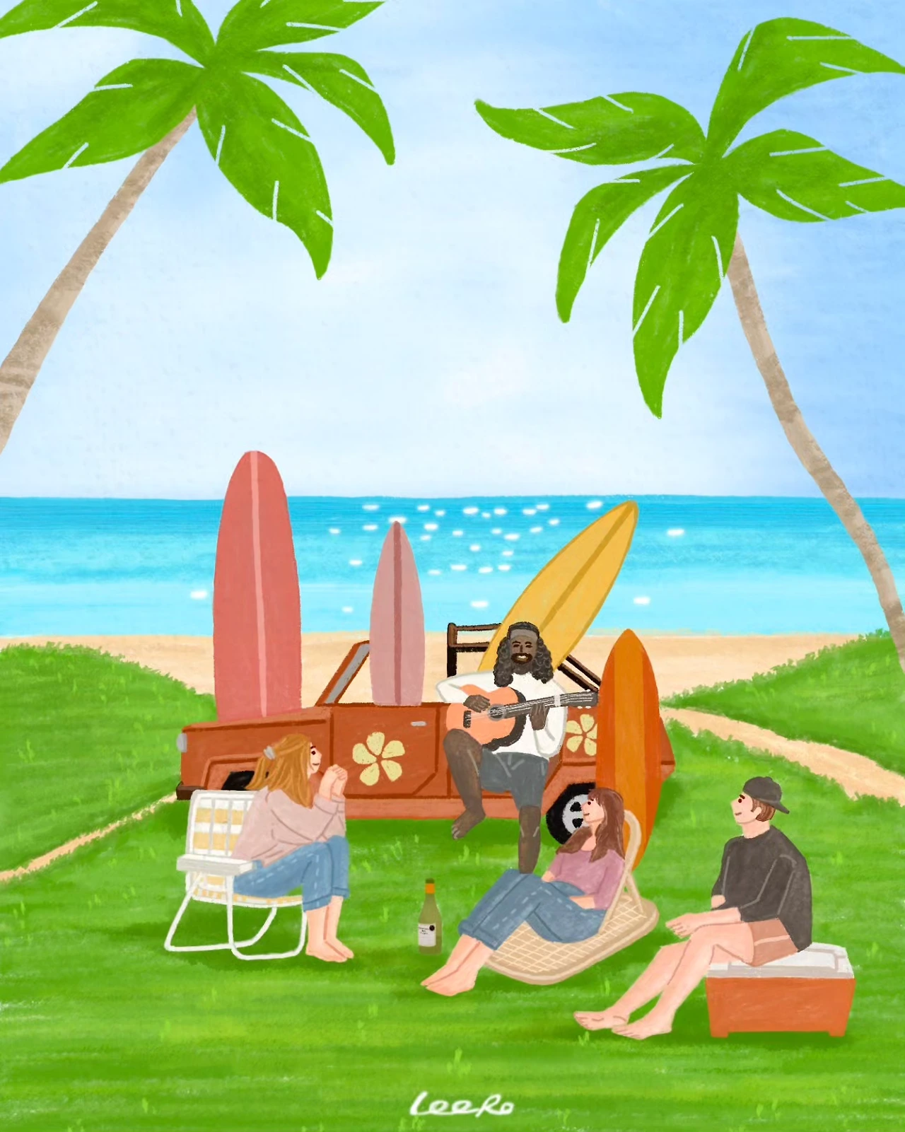 개인적으로 겨울보다 여름을 더 좋아하는데 다음달이면 휴가시즌이네요. 어떤 휴가를 보내는 모습을 그릴까하다가, 친구들과 함께 바다가 보이는 곳에서 흥겹게 노래부르는 모습을 그려봤어요. 생각만해도 시원해지고 머릿속에 바다바람이 느껴집니다 ㅋㅋ