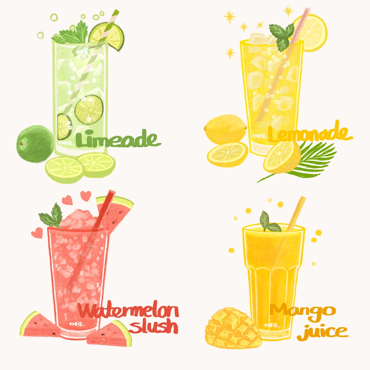 #음료일러스트 #수박슬러시 #라임에이드 #레몬에이드 #망고쥬스 #여름음료 #lemonade #limeade #watermelon #watermelon_slush #mango #mango_juice