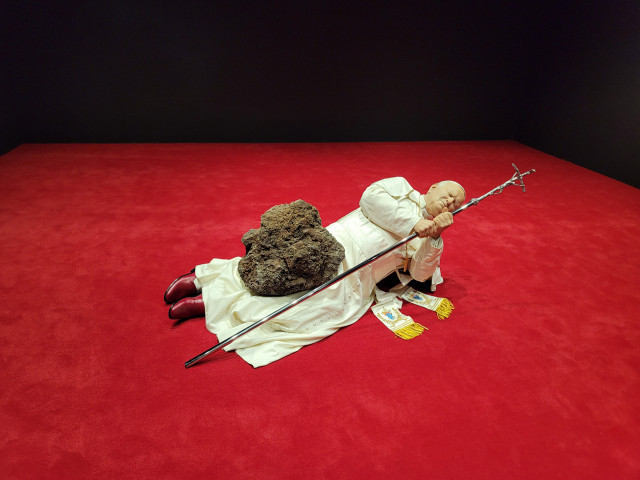 바나나의 화가 마우리치오 카텔란의 교황이 운석에 맞아 쓰러진 듯한 조각상이다. 신성모독인지 아니면 의연히 혼란한 세상에서 십자가를 지키는 성직자의 모습인지 정작 화가는 답이 없다.