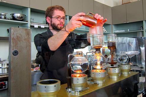 위에서 언급한 것처럼 2002년 샌프란시스코에서 한 식당에 월세 600달러로 귀퉁이를 빌린 뒤에 로스팅을 하였고, 주말에는 커피 카트를 끌고 시장에 나가 주문을 받는 즉시 커피콩을 저울에 달고 갈아서 한잔 한잔 정성스러운 핸드드립 커피를 팔아 지역의 명물이 되었습니다.