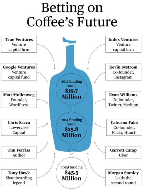 블루보틀이 투자받은 것에 대해 좋지 않게 평가하는 사람들도 있다. 특히 테크 기업들의 투자를 받으면서 “블루보틀은 테크 회사들 바로 옆에 들어서 있으면서 썩 괜찮은 커피를 팔기 때문에 투자를 받았다."라고 말한 칼럼니스트 케빈 루스가 대표적인데, 일리가 있는 말이기도 하다. 독일 최대 소프트웨어 회사 SAP의 팰러 알토 건물이나 트위터 본사 1층에 블루보틀 매장이 입주해 있으니 말이다. 하지만, 비즈니스에서 사람과의 만남 그리고 그의 마음을 사로잡는 것도 실력인걸 부정할 수는 없지 않나. 블루보틀 커피의 투자자들은 유독 그러한 사람들처럼 보인다. IT업계의 거물 트위터 공동창업자인 에반 윌리엄스, 워드프레스 공동창업자 맷 멀런웨그, 락밴드 U2 싱어 보노, 배우 자레드 레토와 토니 호크, 인스타그램 창업자 케빈 시스트롬 등 개인 투자자들이 많으니 말이다. 어쨌든 블루보틀은 성장을 위한 투자를 받았고 이를 도약하는 기회로 현명하게 활용했다.