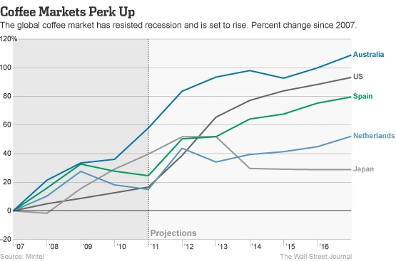 그런 측면에서 2015년 2조 3000억 달러(2,440조 원)인 세계 커피 시장은 거대한 시장이자 여전히 성장하고 있는 시장이며 특히 스페셜티 커피의 점유율은 제3의 물결 트렌드를 타고 급성장하고 있다.