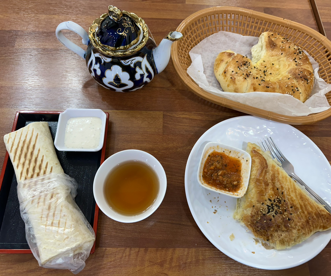 무슬림인듯한 주인장에게 담백해 보이는 빵 1개, 속에 소고기 들어간 사모사 같은 빵 1개, 서브웨이 샌드위치 같은 케밥에 그냥 티를 시켰다. 담백해 보이는 빵은 옆 테이블 두 군데서 먹는 걸 보니 어떤 음식에도 빠지지 않는 주식인 듯하다. 먹으니 정말 담백해서 질리지 않았고, 소고기 들어간 빵은 뜨겁고 고기가 많이 들었는데, 향이 강했다. 케밥은 서브웨이보다 10배 맛있고, 그냥 티(레몬티는 2천 원)는 천 원으로 괜찮았다. 잘 먹은 후 고맙습니다를 우즈벡 말로 뭐냐 물었는데 주인장이 못 알아듣자, 옆테이블의 젊은이들이 라흐맛(?)이란다. 라흐맛, 라흐맛, 몇 번을 읊조리자 다들 웃는다. 같이 웃는다. 나오면서 우즈벡 전통빵(2천 원?) 한 덩이 샀다.