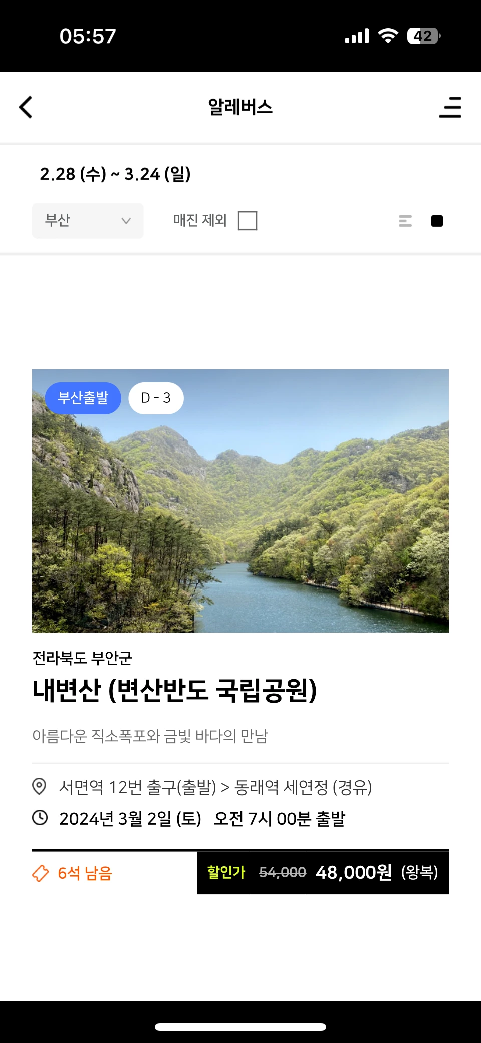 다시 지금으로 돌아와서 등산 관련 검색하다가 알레버스란 걸 알게 됐는데, 20세기 산악회 버스와 별 차이 없고, 무엇보다 부산에서 출발하지 않는다. 그렇게 유야무야 잊고 있었는데, 알레버스 앱을 우연히 알게 됐다. 서면 지하철역에서 출발한다.(현재는 주말뿐) 머리가 갈까 말까 망설이는데 몸의 편리성이 바로 결제해 버렸다. 필요성 보다 편리성이 소비를 결정한다. 사랑도, 관계도 편리해서 해지가 쉬운 세상이니 어련할까 싶다.