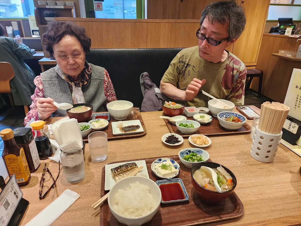 가정식 백반 파는 체인점 식당에서 고등어조림으로 저녁 먹고, 천변에 앉아 쉬다가 공항으로 출발했다. 실제 비행시간은 30여분 정도밖에 안 걸리는 후쿠오카, 70대, 50대, 40대 가족이 함께 한 첫 해외여행이었다.