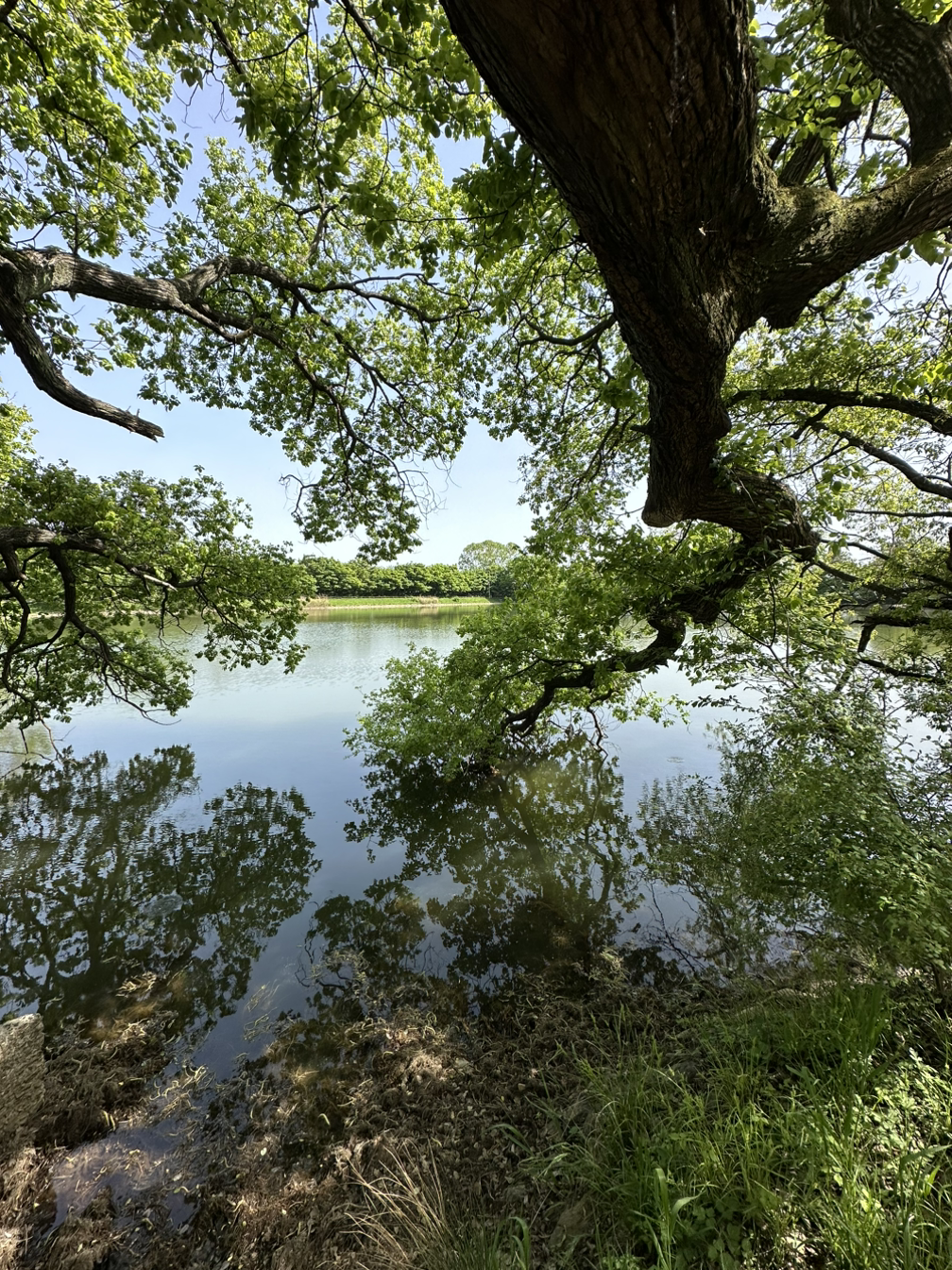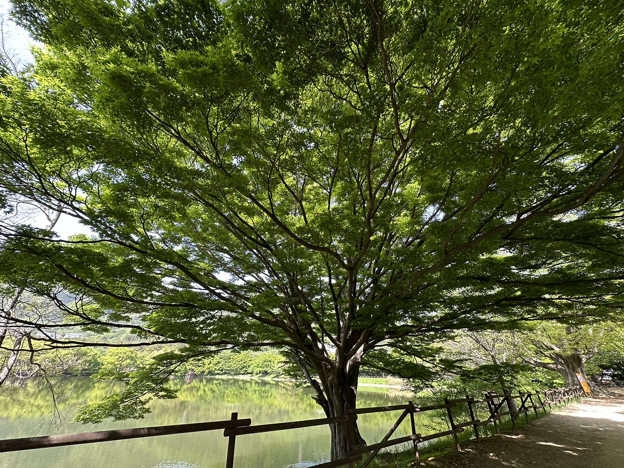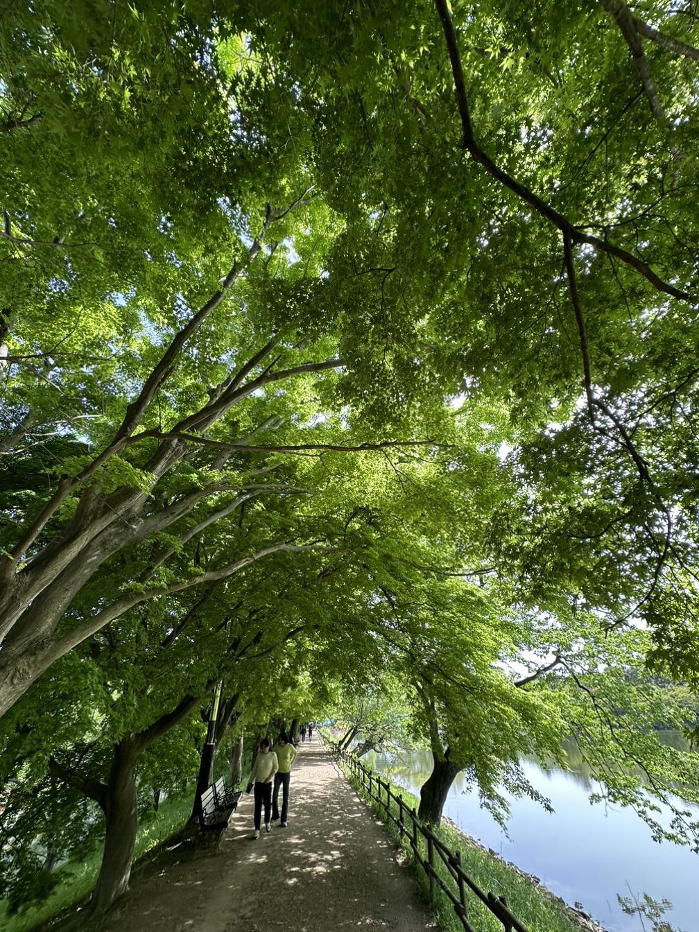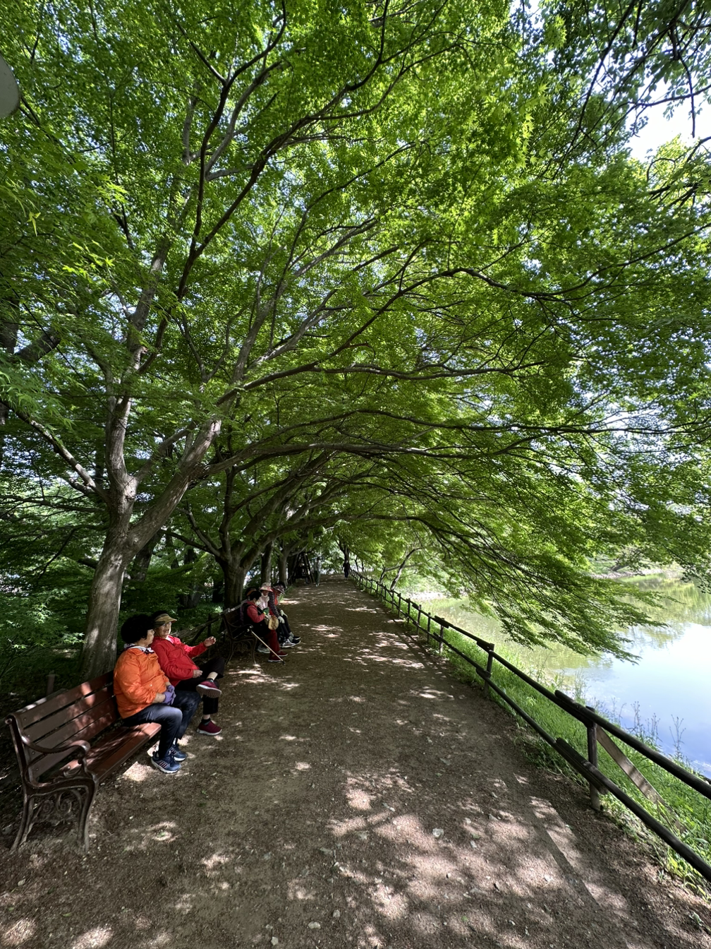 해가 뜨기 직전의 밝음과 어둠이 공존하는 여명처럼 초록이 자신의 색깔을 하나로 만들기 직전, 하나의 초록색이지만 짙고 옅은 온갖 색을 선보이고, 햇빛을 받을 때마다 달라지는 이때가 초록이 절정인 시기다. 공원 중앙의 연못과 둘레를 감싸고 있는 나무와 산책로, 주변 산의 어울림이 과하지 않아 편안하다.