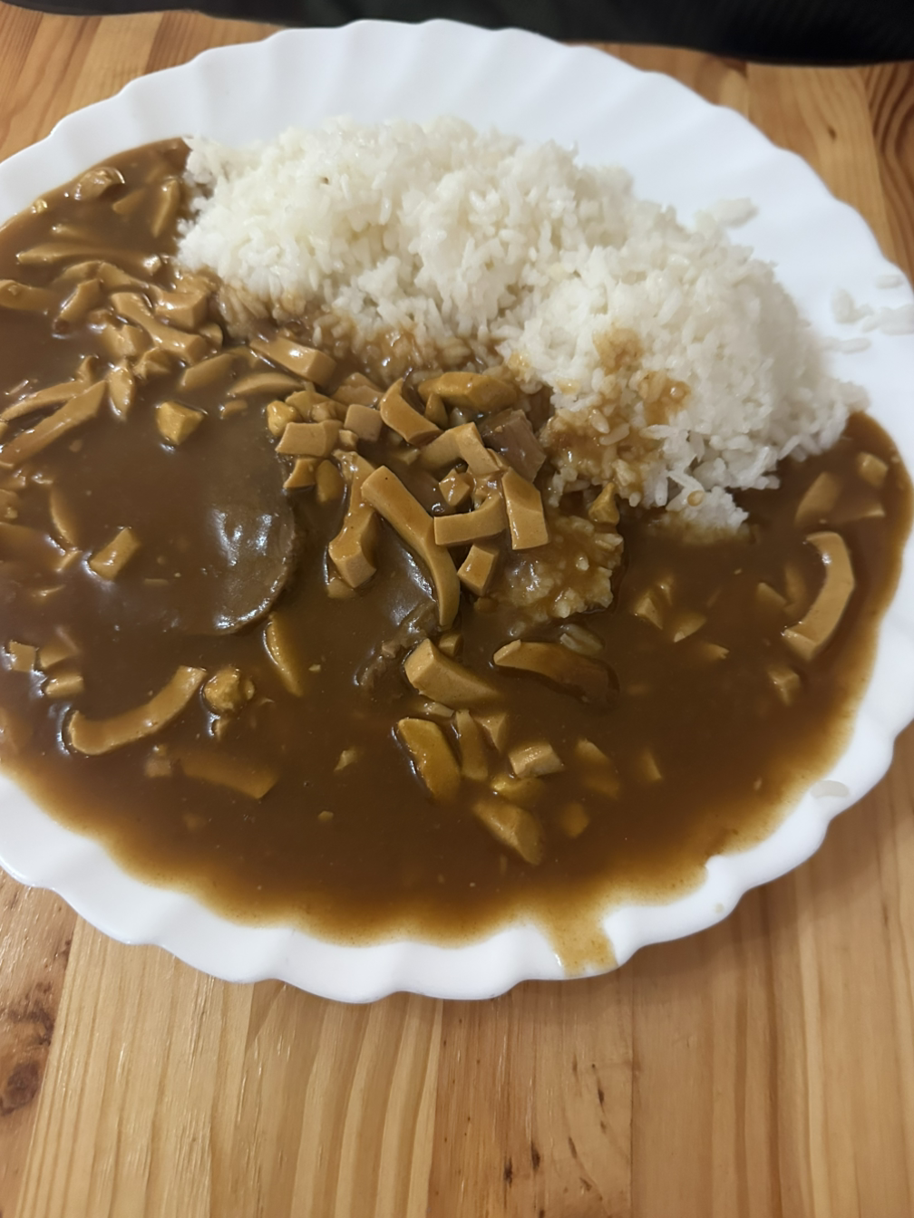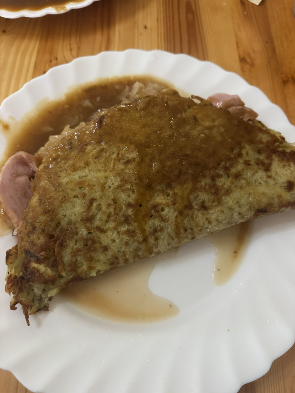 체코어만 되고 메뉴판이 없어서 염치 불고하고 옆 테이블 손님들 음식을 가리키며, 손가락 1개씩 들었더니, 그 손님들이 엄지 척하며 잘 시켰다, 맛있다는 말(을 하는 것으로 추측)하며 환하게 웃는다. 버섯을 잘게 썬 굴라쉬와 잘게 썬 양배추절임과 감자전이 덮밥 형태로 나온다. 이전에 자테츠 식당에서 먹었던 굴라쉬가 정통을 내세우며 비싼 레스토랑 비주얼이라면 여긴 동네 사람 누구나 먹을 수 있는 저렴한 분식집 버전이랄까?