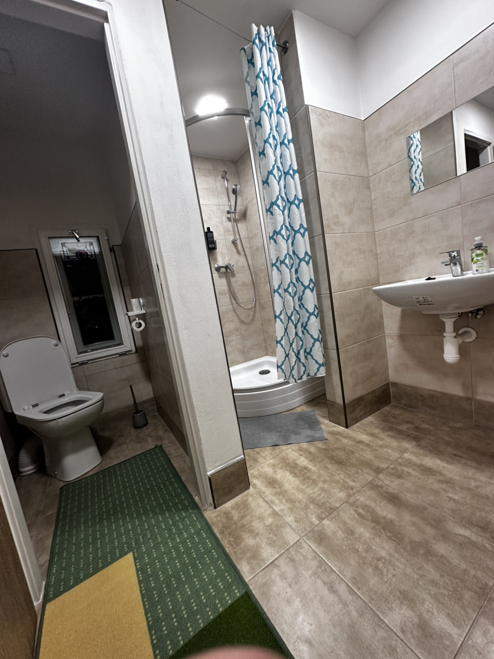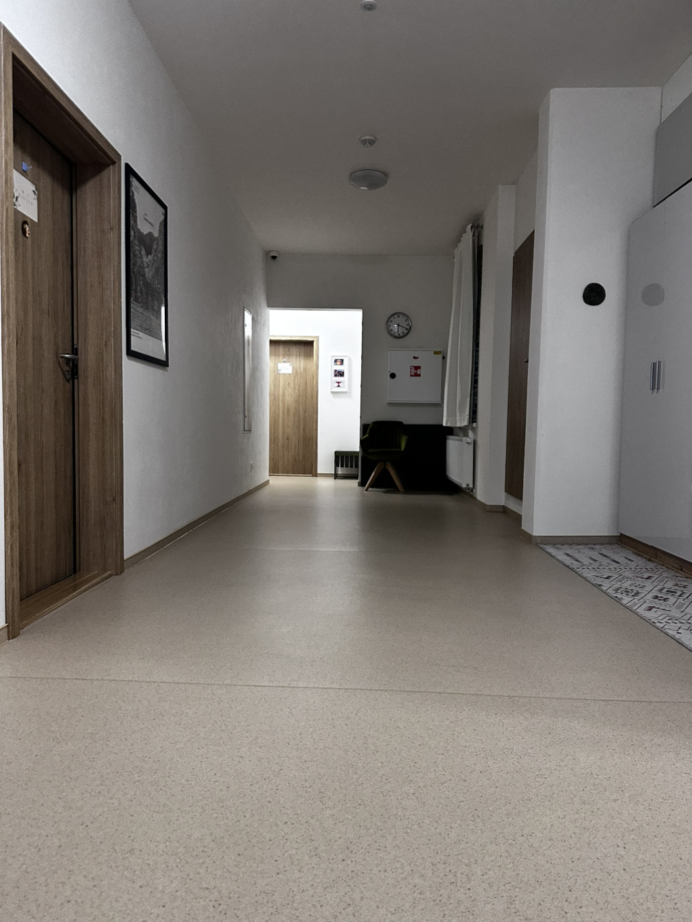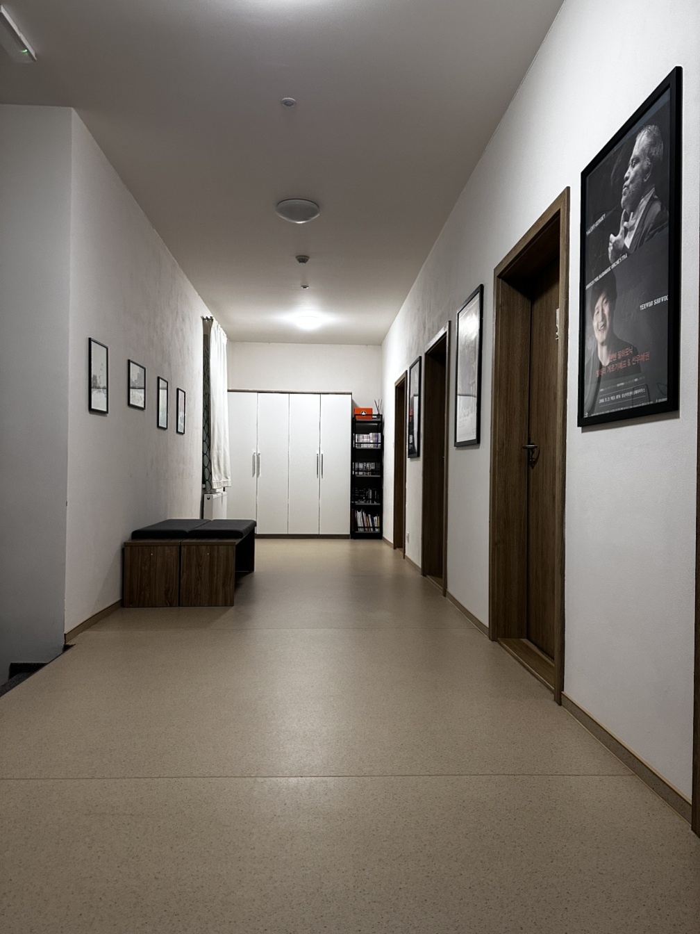 이제 식사준비를 할까? 방문을 나서면 센스등 켜지는 띵~ 하는 소리, 휑하다 싶을 정도로 여유로운 복도(전직 파리민박 운영자는 이 넓은 복도에 이케아 2층 침대가 몇 개 놓을 수 있나 싶다)는 서늘한 밤 기운으로 맞이하고, 모든 룸에 욕실이 있으니 공용욕실을 전용욕실로 사용 중인 싱글룸(이 얼마나 좋은지, 혼자 지내는데 불편 없을 정도로 넓고, 방안에 화장실 없으니 위생적이고) 숙박자는 화장실 들러서 고양이 세수하고 2층 공용부엌으로 내려간다.