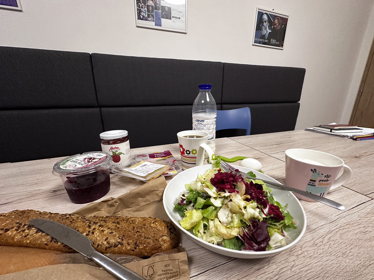 전기포트에 물이 끓는 동안 원두를 갈고, 야채샐러드와 빵, 잼, 치즈, 햄, 요거트를 챙긴다. 귤이나 오렌지, 삶은 달걀이 추가되기도 한다. 물 외의 먹거리는 여행자로 퇴근할 때 숙소 옆 슈퍼마켓 빌라에 들러 장을 봐온다. 내가 볶은 콩이 아니고, 같은 브리타를 써더라도 물맛이 다르고, 하리오 드립방식 필터라 커피맛이 다른가 싶었는데, 참나~ 아라비카+로부스타 블렌딩 제품이었다. 어쩐지 탄 맛이 강하다 싶더니…