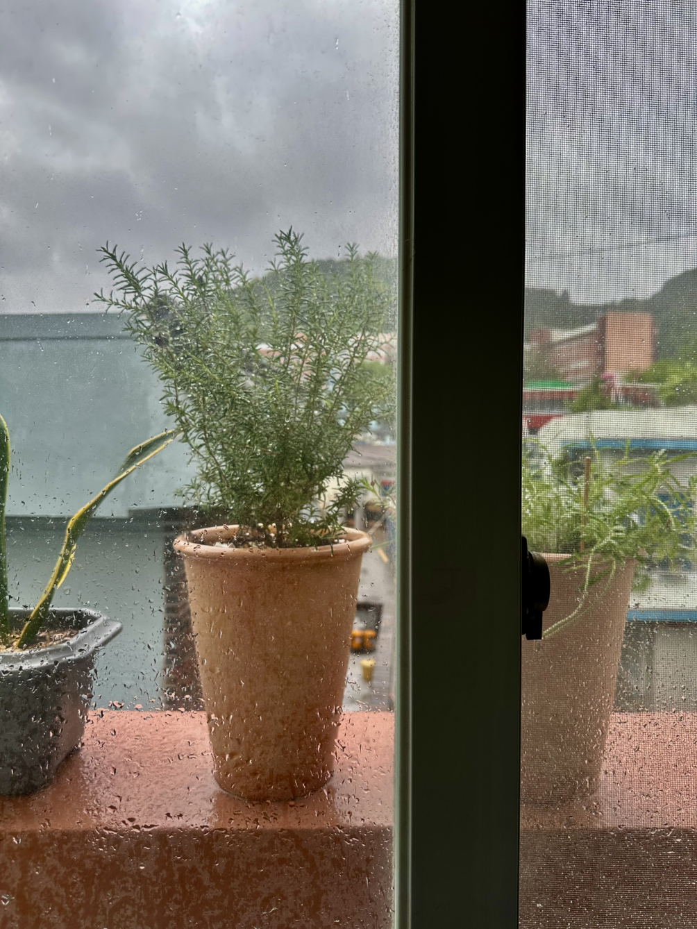 오늘 아침은 빵 2개, 꿀과 계피가루, 올리브오일 두른 토마토와 삶은 계란, 뭘 먹든 마시는 커피를 내리는데 어라~ 유리창에 빗방울이 제법 맺혔다. 화분을 서둘러 창밖에 내놓았다. 산성비니 뭐니 해도 식물에게 수돗물에 비해 훨씬 나을 거다. 먹거리 텃밭용으로 장만한 제일 무거운 화분은 옮기기도 힘들고 애물단지가 되어간다. 가장 관심을 끌었던 녀석인데... 집 근처 마트에서 토마토와 상추 모종을 사서 심었는데 상추는 진작에 떠났고, 토마토는 모종 때 크기 그대로다. 토마토는 단면을 잘라 묻으면 싹이 난다는 걸 어디서 본 적이 있어 어제, 오늘 쿠팡에서 샀던 토마토 꼭지 부분을 잘라 흙 속에 뒀다. 별 기대없이 씨앗을 묻었던 아보카도처럼 어느 순간 쑥쑥 자라길 바라는 건 욕심일까? 희망은 품을 수 있잖아.