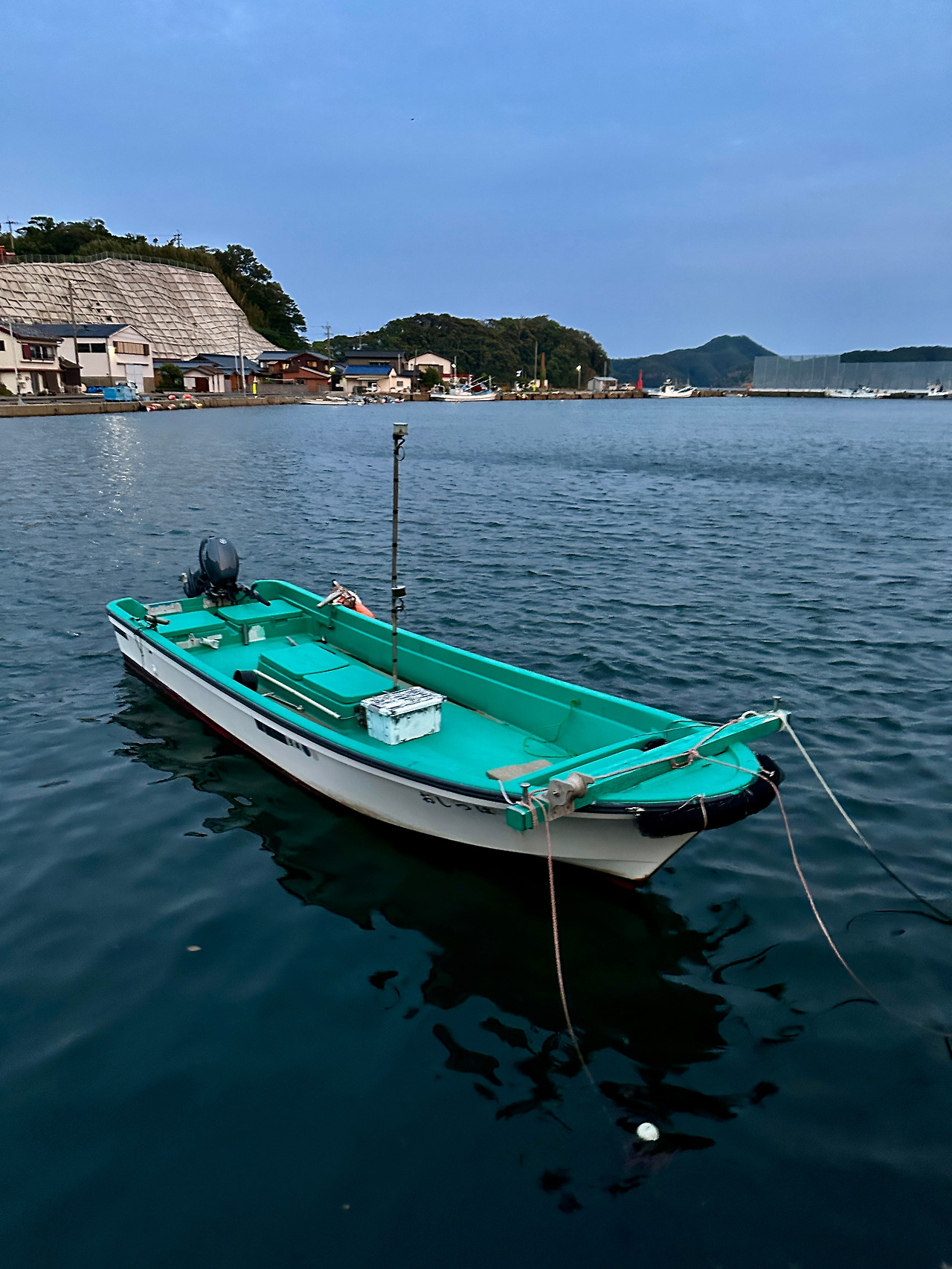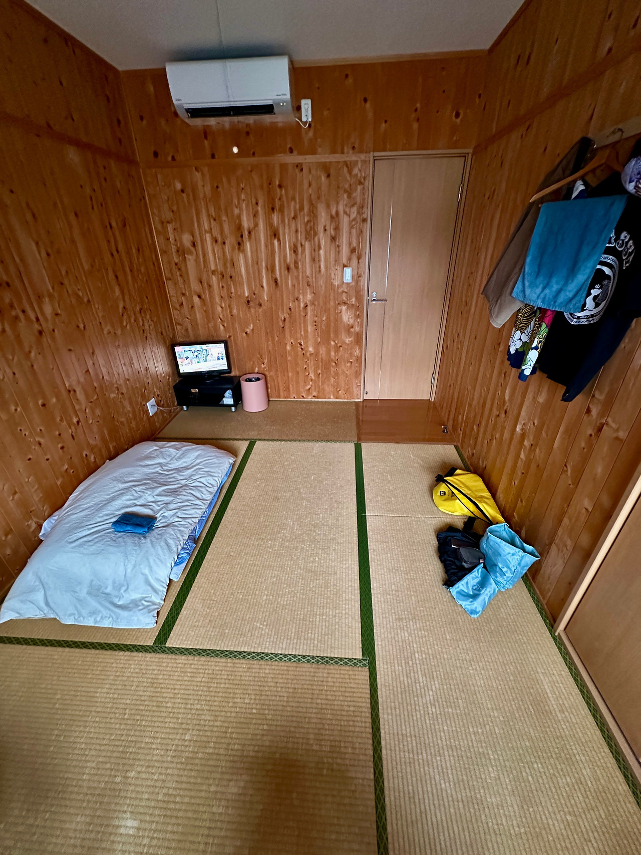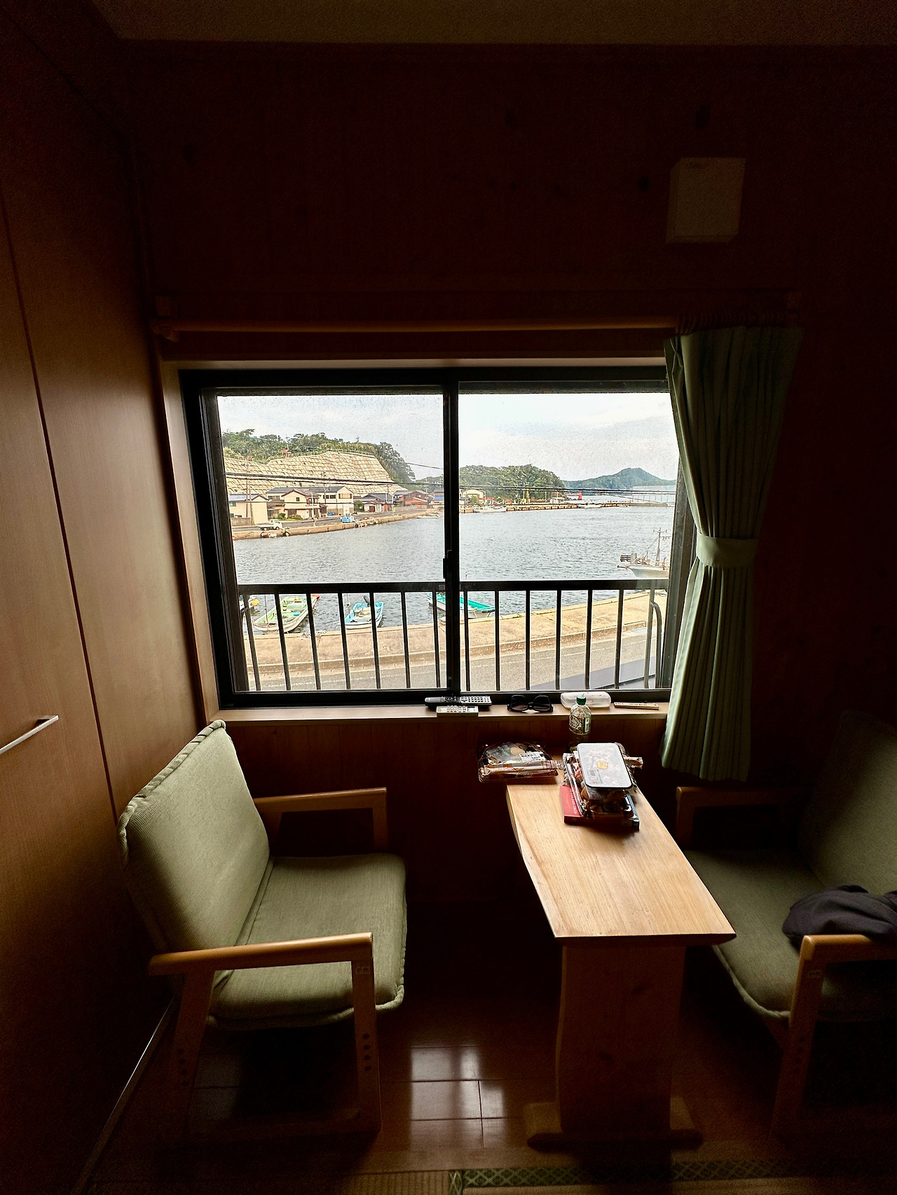 공동욕실과 화장실을 안내하고, 머물 방은 침대가 아닌 이부자리를 까는 다다미방이다. 창가에 의자와 테이블이 놓여있고 창 너머로 작은 동네 항구가 바로 앞이다. 세이잔지가 더 비쌌으니 스펙이 좋은 건 당연하지만 여긴 너무 '단출'해서 마음이 단순해진다. 비 오는 날 머물기는 여기가 더 좋을 듯하다.