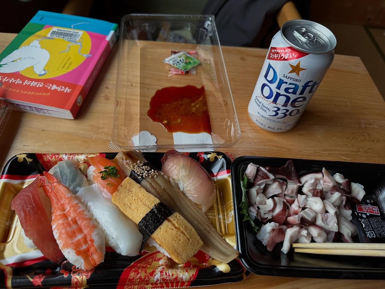 자전거를 몇 시간 타고 숙소로 돌아오면서 히타카츠항 근처에 있는 슈퍼로 갔다. 가격표나 상품명은 일본말로 적혀 있는데 들리는 건 한국말이고, 쇼핑하는 한국인들로 넘쳐난다. 순간 한국 슈퍼에 있는 줄~ 오늘 저녁과 내일 아침 식사거리를 사야 하는데, 뭘 먹나? 돌아다니다가 초밥과 문어숙회, 도시락(해당 매장에서 만들었는지 밥에 온기가 있었다), 빵(교토 여행 때 슈퍼에서 사 먹은 빵이 너무 맛있었던 기억으로)을 사고, 맥주 4캔을 사서 돌아왔다.