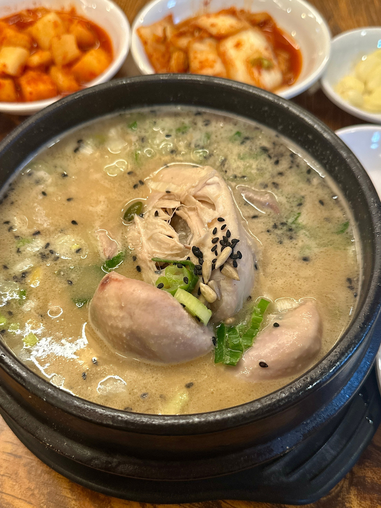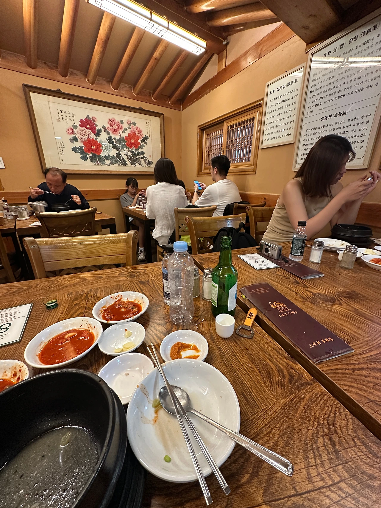 다시 서울역사박물관으로, 왔던 길을 되돌아오는 게 재미없어서 골목길로 접어들었고 이리저리 헤매다 보니 토속촌 앞이다. 몇 번 올 때마다 긴 줄이 늘어져 있었는데, 점심시간대를 한참 지나서인지 문 앞이 한적하다. 갑자기 지난 3일간 힘든 택배노동으로 고생한 몸을 격려해줘야 한다는 측은지심에 날씨도 한여름인데 50대의 몸을 돌봐야 한다는 의무감에 가게 안으로 들어섰다. 며칠 동안 서울의 비싼 밥값에 후달리며 어느 정도 적응됐다 싶었는데, 후와~ 삼계탕 2만 원이다. 물 반 고기반이라더니 내국인 반, 외국인 반이다. 한국말, 중국말, 동남아시아말이 자연스레 들려오는 다국적 식당이다. 아시아계 관광객에겐 이미 인증샷 성지가 되었는지 연신 사진을 찍어댄다. 삼계탕 국물을 한 입 떠 넣는데, 키야~ 소주를 안 시킬 수가 없다. 건너편에 혼자 앉은 젊은 여성이 삼계탕을 앞에 두고 이걸 어째 먹어야 하나 멈칫대는 것 같아,