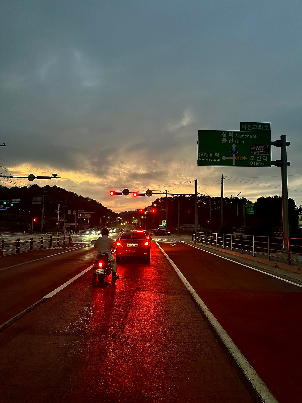 포항을 벗어나자 왕복 4차선 7번 국도에 다니는 차량이 별로 없다. 감히 정우성을 흉내 내며 최고 속력(이라 해봐야 80km)으로 달리는데 구경하는 사람의 눈에는 임창정으로 보였을 수도 있겠다. 어쨌든 오른쪽은 막힘없는 망망대해가 펼쳐지고, 해가 저물어가며 불그스레하고 어슴푸레한 색깔이 겹쳐서 멋짐이 한동안 계속된다. 삼척(동해)까진 최소 2시간 이상은 더 달려야 하는데 도착하면 너무 늦는 데다(지난번에도 그러더니 삼척은 마의 벽인가?) 첫날부터 무리하자 말자 싶어 울진으로 목적지 수정, 그러자 비가 그쳤다.