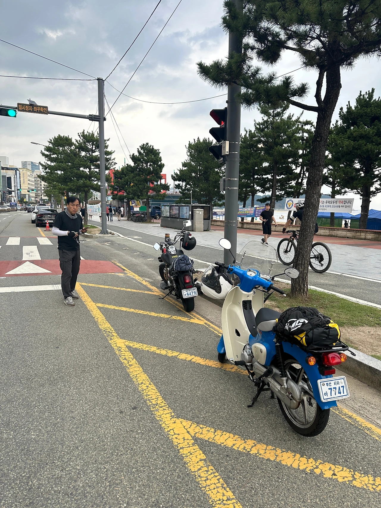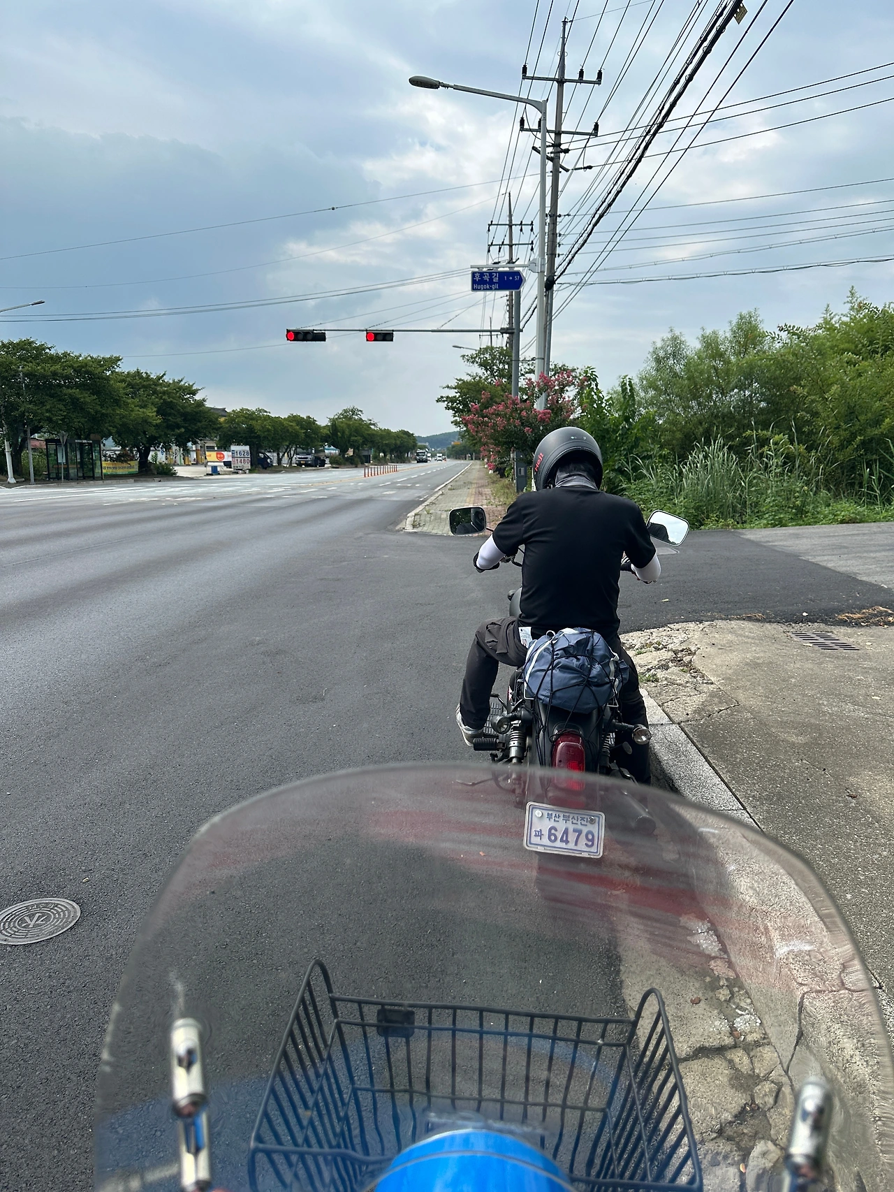 푹푹 찌는 더위에 지쳐갈 즈음 도착, 시원한 아아를 사러 커피스미스 매장에 들어갔는데 쾌적한 에어컨 바람에 반해서 파트너 형을 불렀다. 30여분 수다 떨고 출발, 엄청 습하긴 해도 해가 없어서 라이딩하기 괜찮다. 영일대해수욕장을 조금 지났나? 빗줄기가 굵어져서 우의 상의를 입었는데, 곧이어 오토바이 헬멧에 떨어지는 빗소리가 후드득후드득 들릴 정도로 퍼부어 하의마저 꺼내 입었다. 그 짧은 시간에 바지는 다 젖었다.