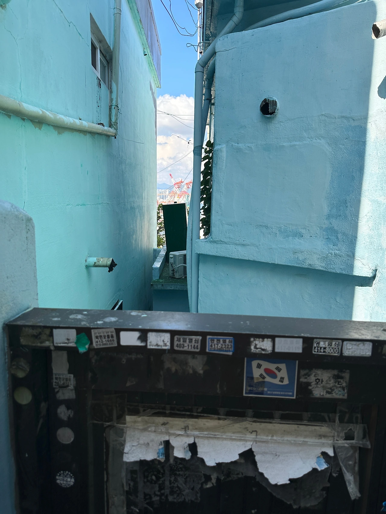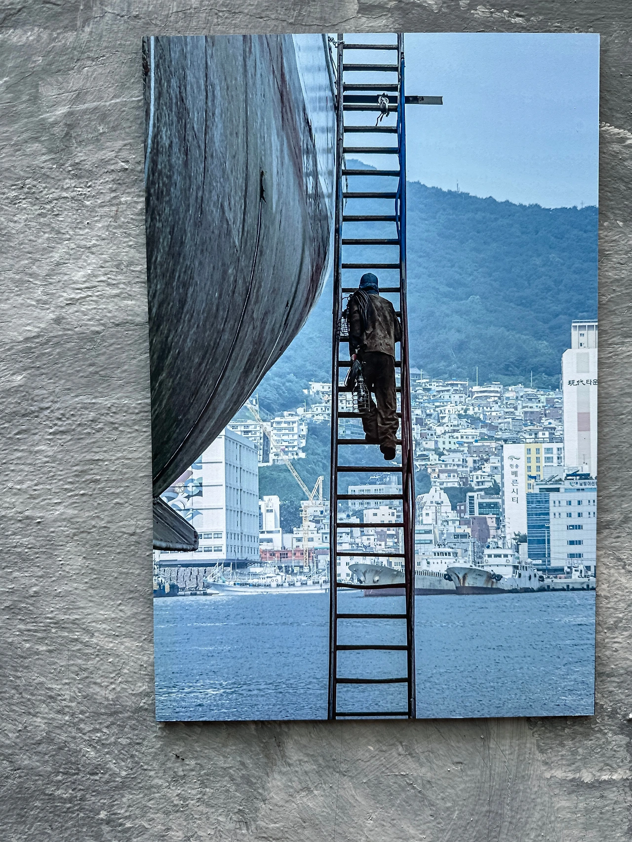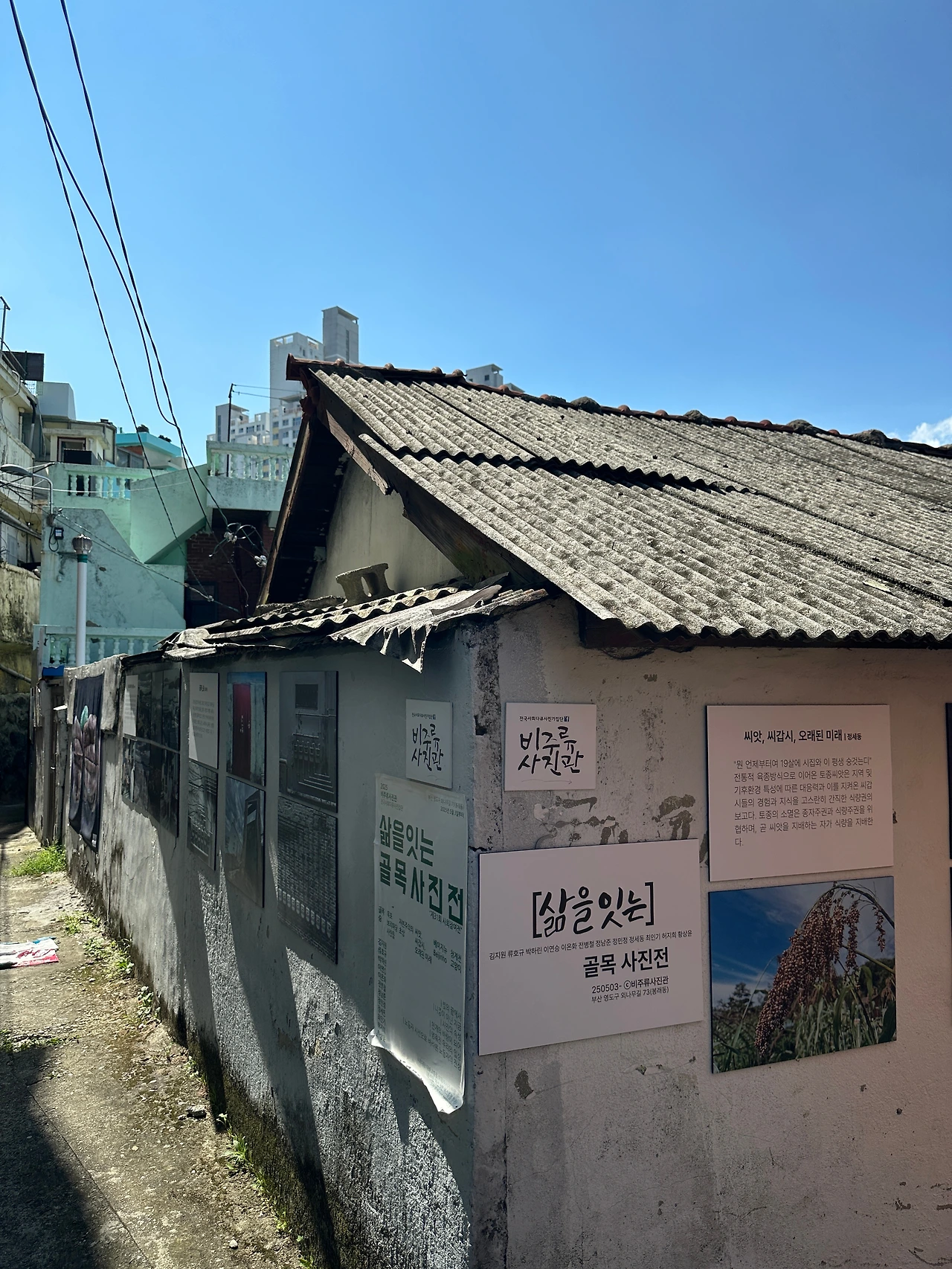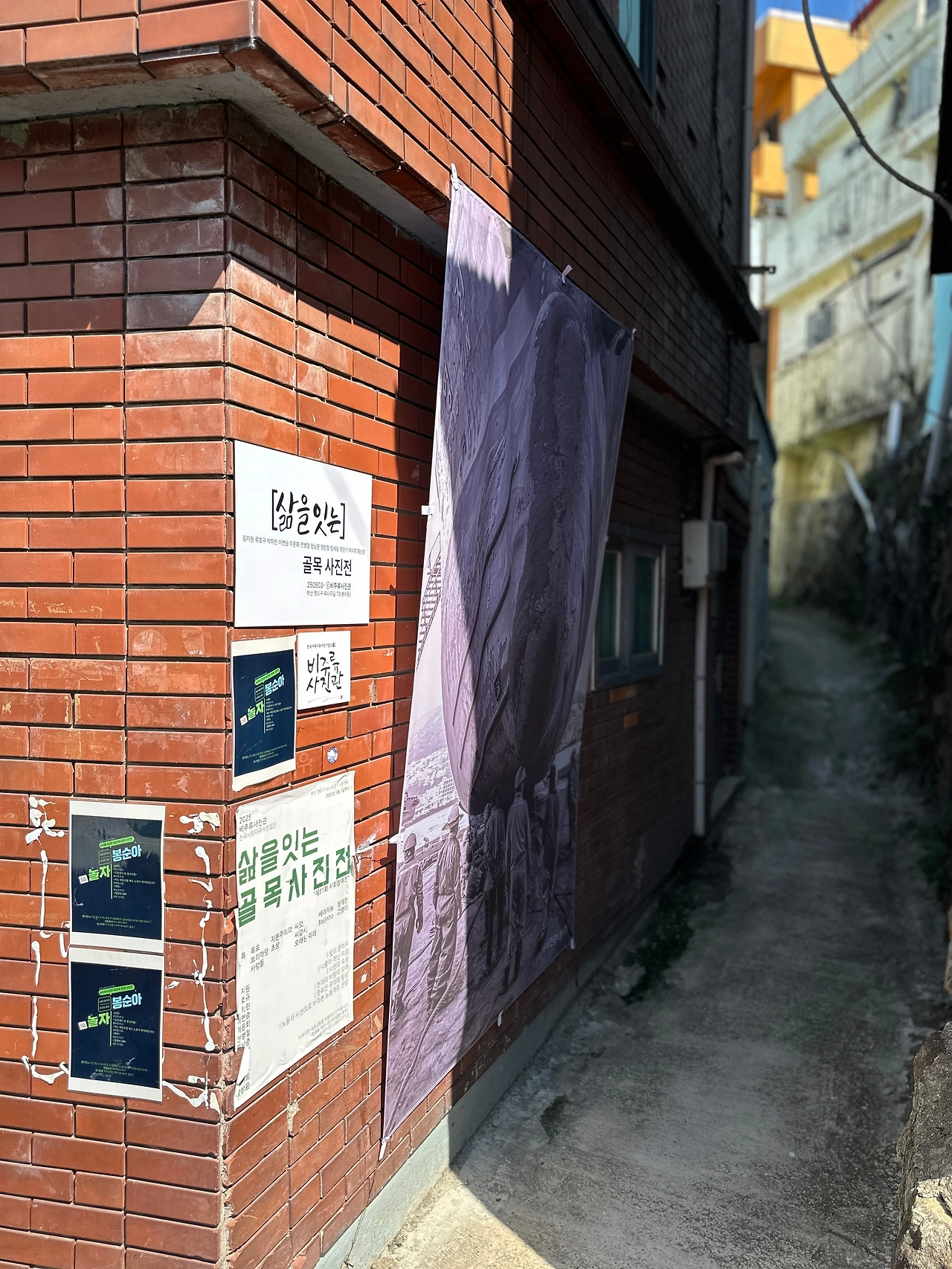 페친 덕분에 알게 된 #비주류_사진관 보려고 오토바이 타고 영도로 쓩쓩~ 웬만해선 슈퍼커브가 못 가는 길이 없는데, 불규칙한 계단이 있는 좁고 비탈진 골목길이라 걸어야 했다. 골목길 군데군데 여러 작가의 사진 작품이 걸려있는데, 명색이 야외전시인데 형식이 많이 아쉽다. 정한 바 없이 이리저리 걷다가 집과 집 사이에 난 틈으로 예전에 조선소가 있었던 곳이 조선소 크레인보다 더 높은 아파트로 바뀐 모습으로 보인다. 조선산업이 한창 번성했을 때 영도의 크고 작은 조선소와 관련 업체에선 노동자가 필요했을 것이다. 먹고살려고 영도로 모여드는 사람들이 많아질수록 어쩔 수 없이 전망 좋은(?) 집을 짓기 위해 산 위쪽으로 올라갈 수밖에 없었을 것이다. 그렇게 마을이 만들어졌고, 산복도로가 생겼을 것이다.