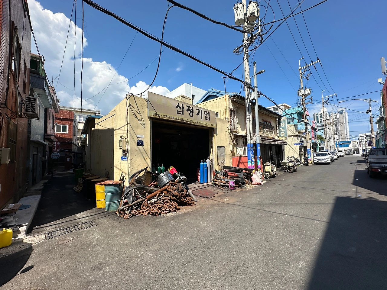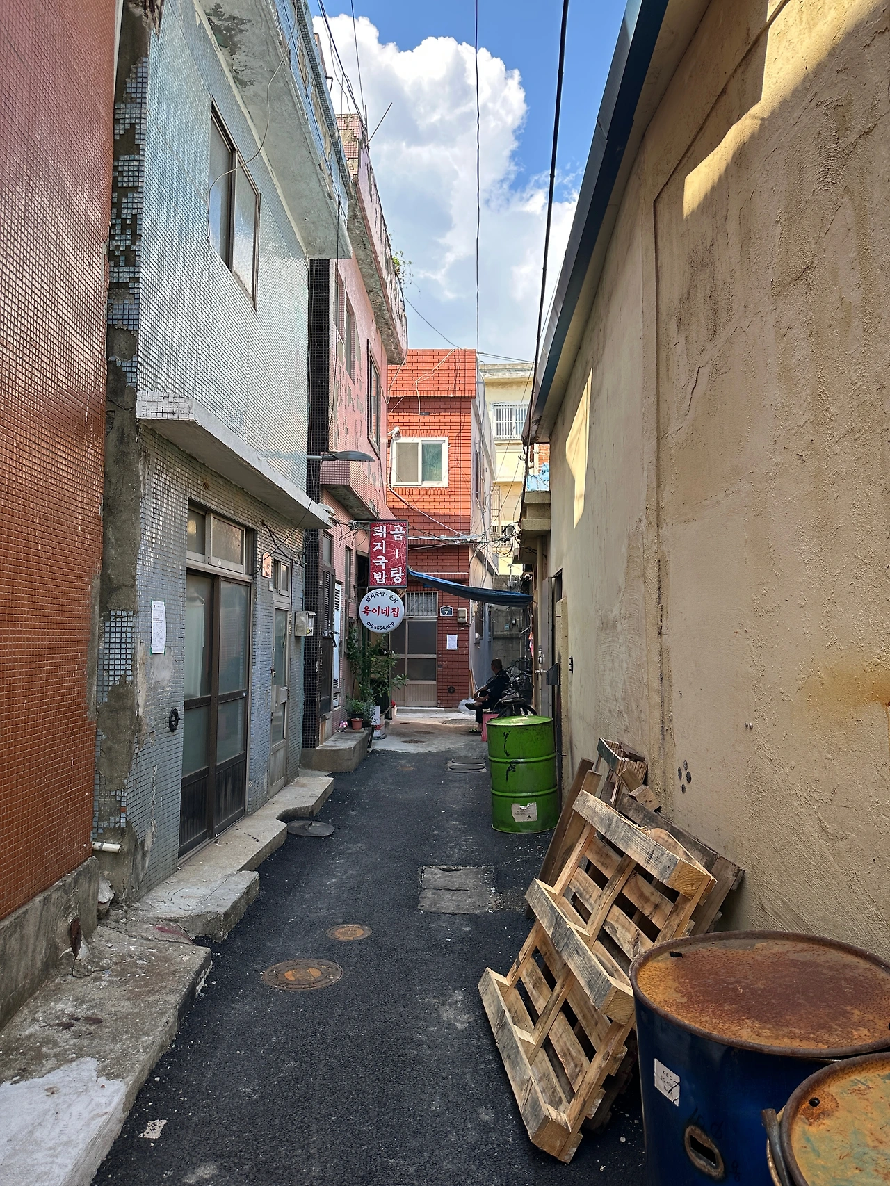 지난번에 문이 닫혀 못 먹었던 옥이네에 갔다. 돼지국밥집인데 물회를 한다. 둘 다 먹어보고 싶은데 50대의 위장으론 혼자서 불가능하다. 그래서 함께 먹어야 단단해진다는 말이 있나 보다. 한때는 두드려대는 망치질로 하루 종일 깡깡댔을테지만 조선소가 거의 사라져서인지 한낮의 태양빛만 쨍쨍하다. 선박 관련 공구를 제작하는 공장들 사이, 좁은 골목안에 있다. 지금보다 더 많은 공장들이 한창 깡깡대던 시절에 낮에는 구내식당을 겸하고, 퇴근 후엔 소주와 막걸리로 한낮의 고된 노동을 풀던 이런 식당이 제법 있지 않았을까?
