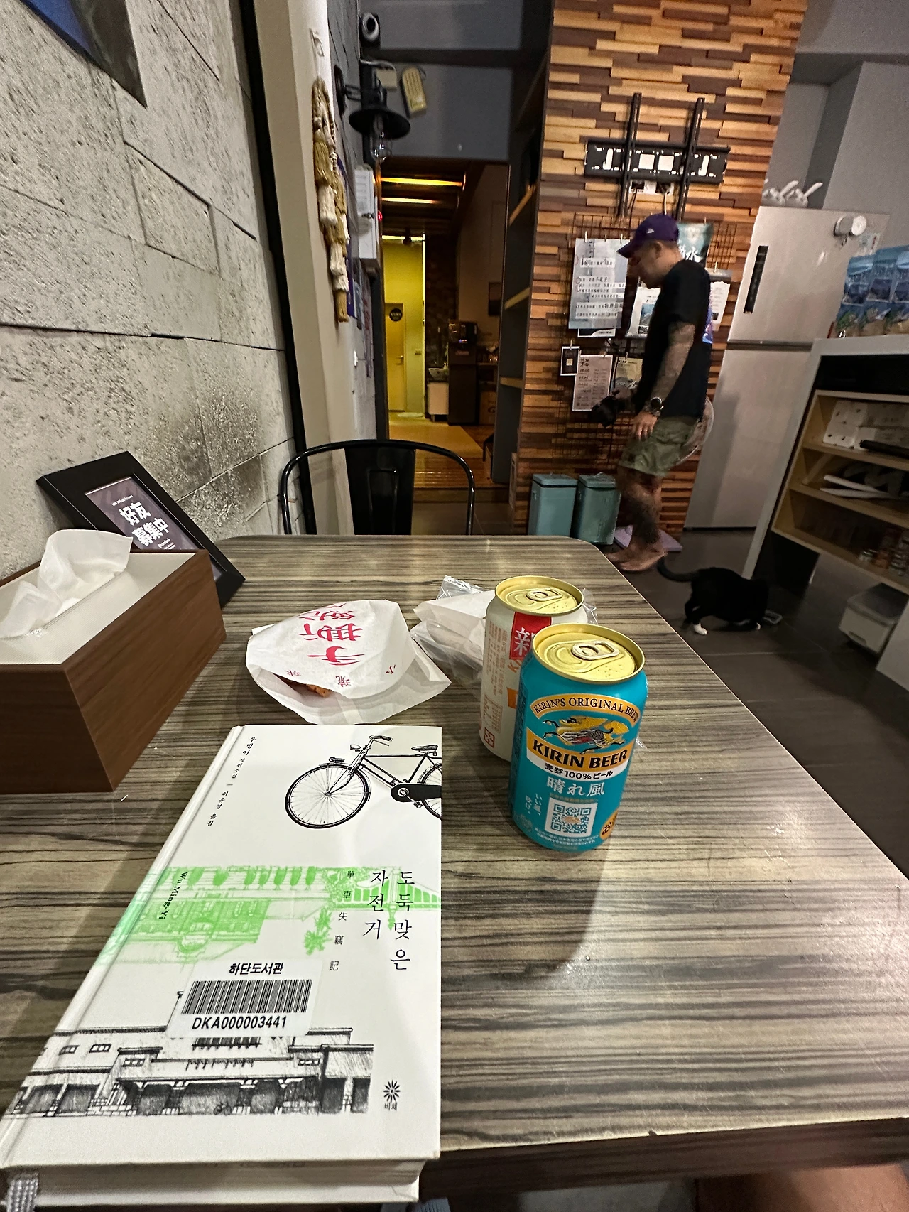바다거북 만나고 류추섬의 마지막 식사를 뭐로 하지? 딱히 먹을 데도 안 보이고, 먹고 싶은 것도 없는데 어딜 가나 가격 대비 만족도가 높았던 편의점에서 먹자 싶어 전가네(패밀리마트)로 갔다. 기린 맥주(일본계라 그런가 했는데 일반 식당도 일본 맥주를 많이 판다. 대만 맥주보다 맛있다) 3캔 묶음과 만두와 청경채가 있는 도시락 형태의 면을 집어 들었다. 계산대에 올리니, 여기서 먹을래 묻기에 고개를 끄덕이자 데워준다. 오~ 좋다. 글씨가 작아 얼마나 돌려야 하는지 안경 벗고 훑는 수고를 하는 노인네들이 수두룩한 초고령사회 아닌가? 한국 편의점도 어서 도입하라! 맥주 2캔을 가방에 넣고 전기 자전거를 타고 숙소로 돌아오다 골목 초입에 있는 오징어구이 집에서 반건조 오징어구이를 2 봉지를 샀다. 맥주를 홀짝이며 대만 작가의 소설이라 들고 왔던 <도둑맞은 자전거>를 읽다가 갑자기 마음을 굳혀졌고, 다음날 가오슝으로 돌아와야 해서 타이둥역 근처에 있는 On My Way Taitung Hostel&Backpacker 숙소를 예약했다. 대만 남부여행을 준비하며 처음부터 마음에 있었지만 일정상 무리한다 싶어서 다음을 기약했는데, 삶이든 여행이든 마음에서 사라지지 않으면 몸으로 나타나게 마련이다. 타이둥, 달라서 굿초이스라니, 다른 걸 보러 가자고!
