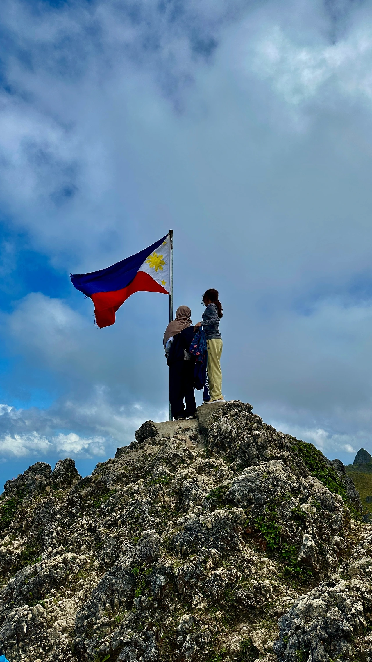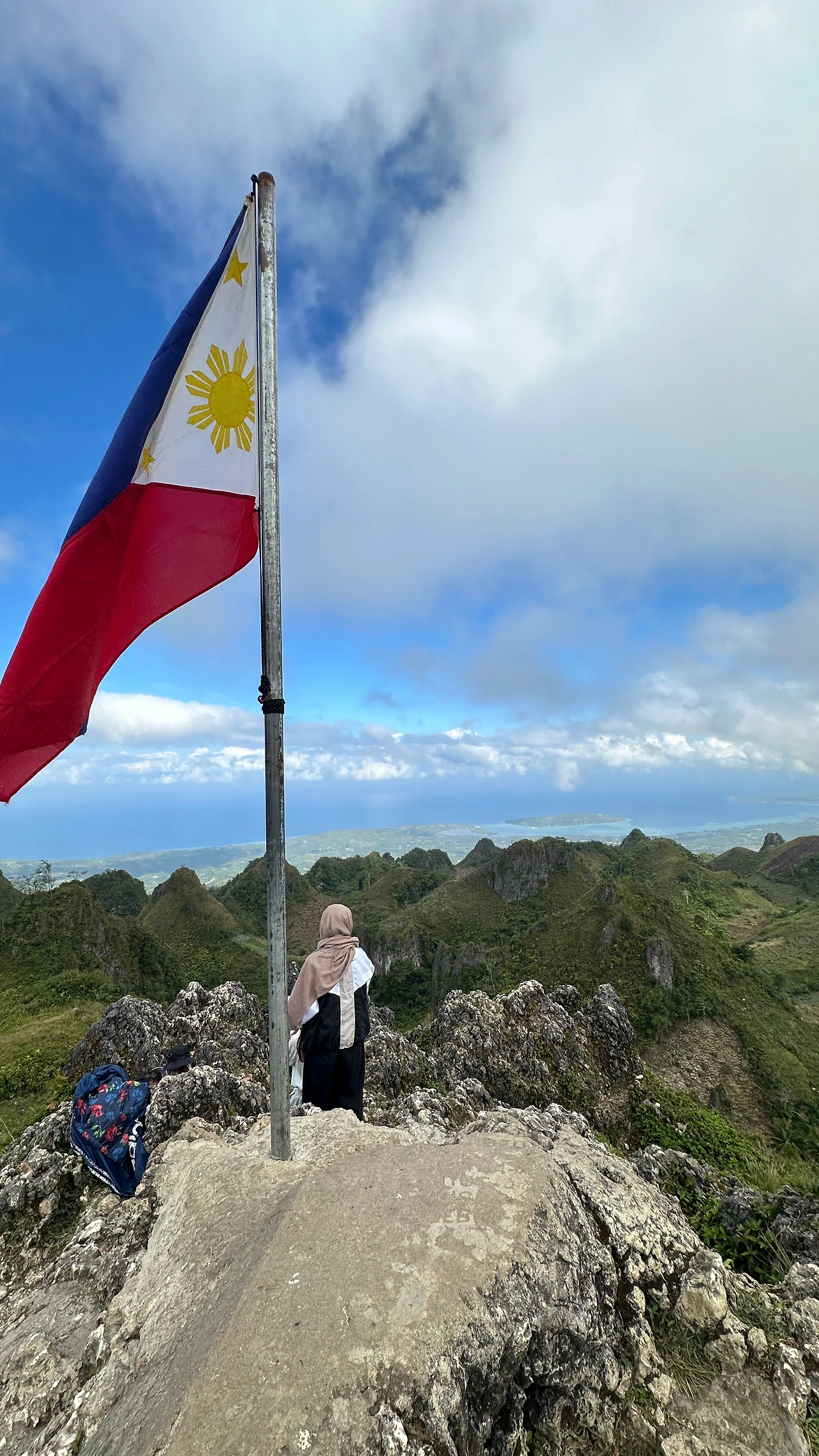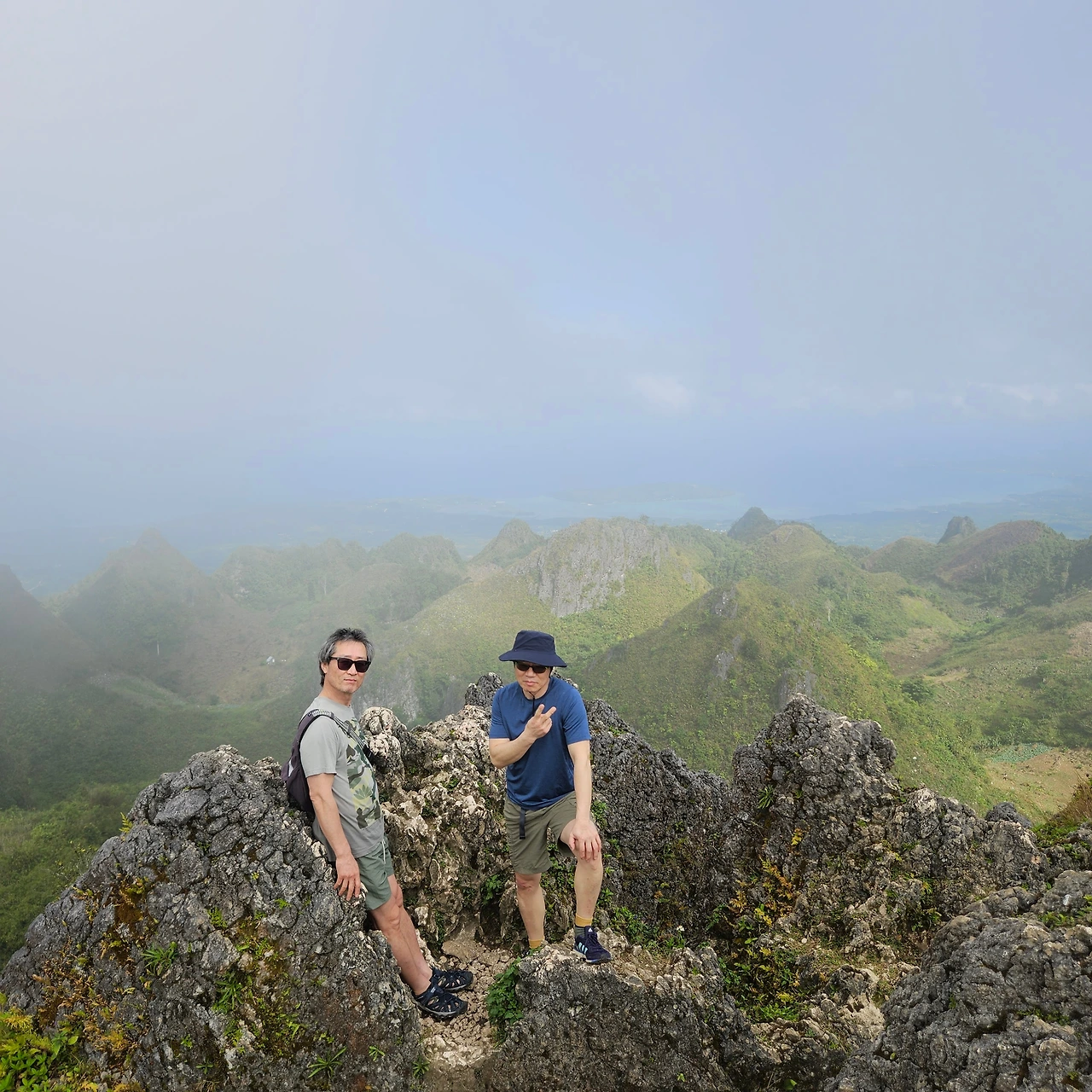 돌산이지만 산세가 험하진 않다. 올라가는 중간에 작은 비닐봉지에 담긴 야생딸기를 파는 여인이 앉아 있는데 누가 온다고 여기서 팔고 있을까 싶다. 맛이 궁금하긴 한데... 내려올 때 사 먹을까? 30분 즈음 올랐나? 필리핀 국기가 휘날리는 정상이다. 10대로 보이는 한 무리의 소녀들이 재잘대고 있는데 순식간에 안개가 뒤덮는다. 갑자기 들이친 안개에 실망한 우리를 위로하려는지 1,000미터 넘는 봉우리라 날씨 변화가 심하다며 안개 걷히면 모알보알 쪽 바다 풍경과 쉴 새 없이 솟은 아기자기한 봉우리가 멋진단다. 언제 걷혀? 니네가 러키가이면 당장!, 하하하 그저 웃었다.