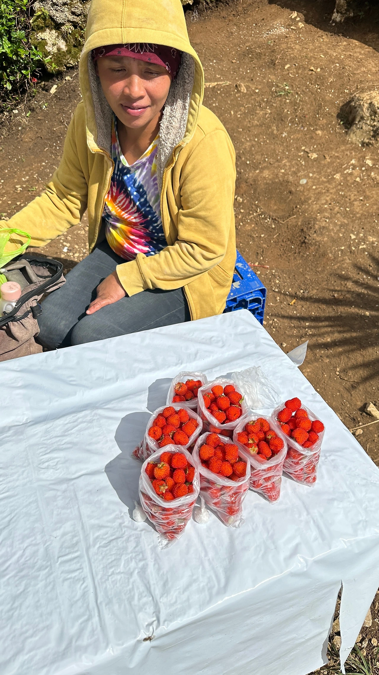 청소녀들이 오오오~ 소리를 내기에 뒤돌아보니 안개가 걷히고 모알보알 쪽 바다가 선명하게 펼쳐진다. 오호호~ 아기자기한 봉우리들이 끝없이 펼쳐진 산맥 같은 멋진 장관을 보여준다. 로젠타 왈 "유어 러키가이!" 이 장면을 본 것만으로도 오스메냐픽, 오길 잘했다. 내려가는 길에 야생딸기를 2 봉지 사서 한 봉지는 나눠먹고, 한 봉지는 루디에게 오스메냐픽이 준 선물이라고 했다.