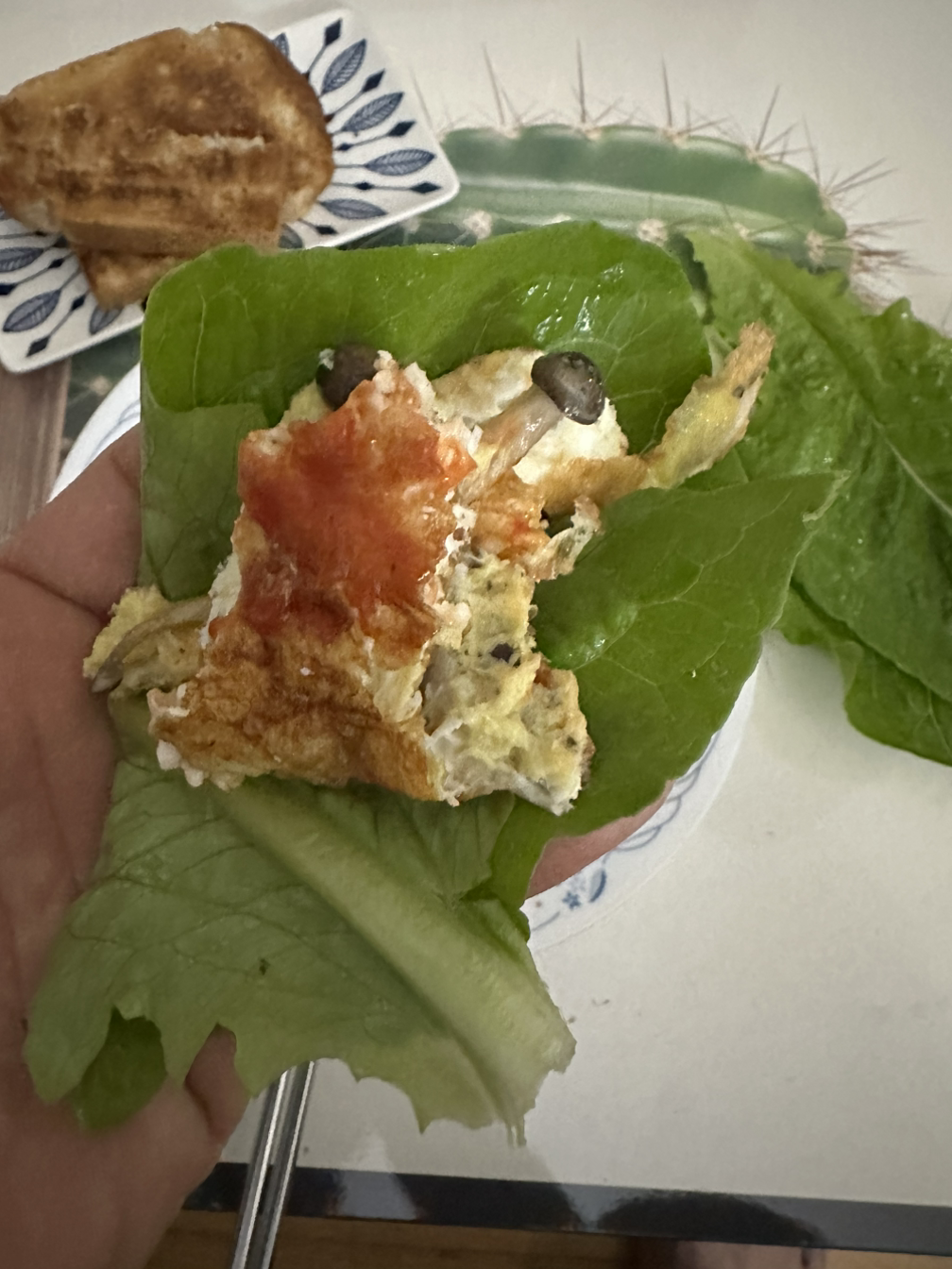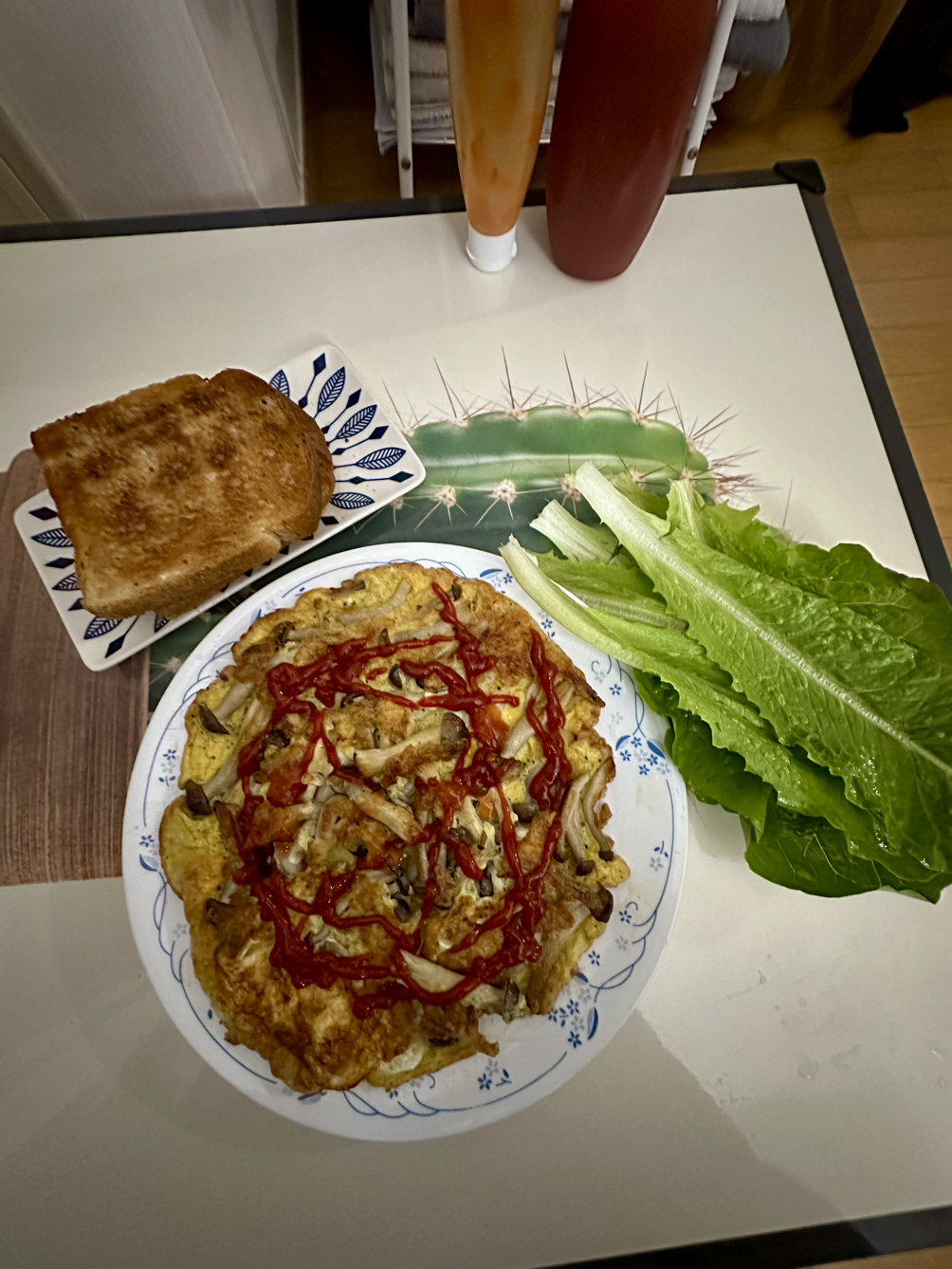보통은 집에 도착하면 씻고 허겁지겁 저녁을 먹는데, 점심을 많이 먹어서인지 오늘은 배가 그리 고프지 않다. 끓여둔 김치찌개(한 번 끓이면 최소 4~5번 먹을 수 있게)는 당기지 않고, 냉동실에 있는 통밀 식빵을 꺼냈는데 어라~ 잼이 없네! 으음… 찌개에 넣으려고 산 만가닥 혼합버섯을 프라이팬에 올리고, 계란 3개를 풀어서 버섯이 살짝 익을 정도로만 굽는다. 냉장실에 들어간 지 며칠 된 상추를 곁들이고. 오호~ 이 조합 괜찮은데! 한 끼 해결했다.