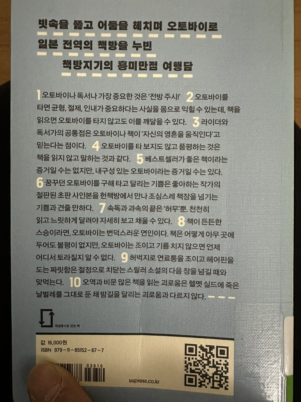20여 년 전 기억을 떠올려 준 고마운 책이다. 술술 읽힌다. 다 읽고 나니 뒷면에 있는 글, 내 오토바이로 헤드핀을 할 일 없고, 하고 싶지도 않으니 9번 빼곤 공감. 특히 전방주시!