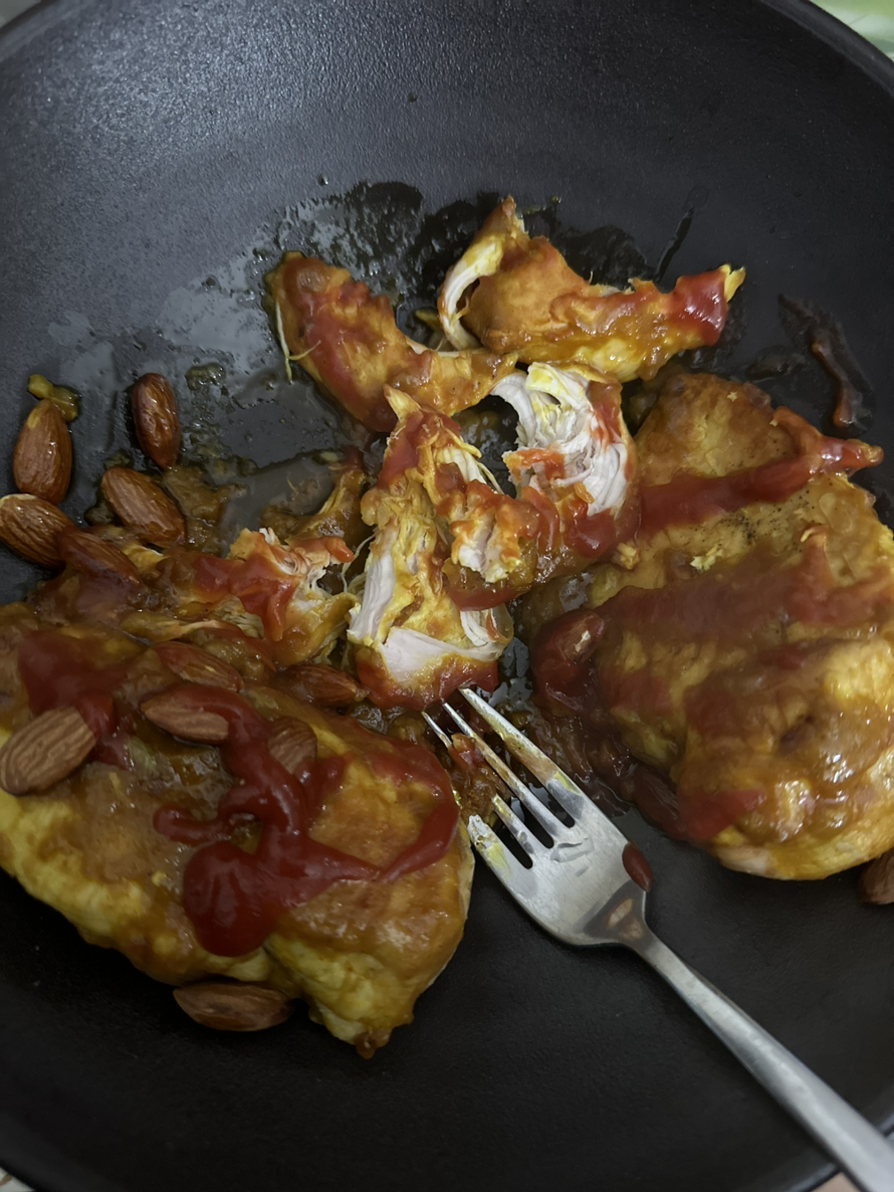 낼모레 80을 앞둔 엄마는 50 중반의 아들이 여전히 걱정이다. 미안하고, 엄마 걱정시킬 시간이 그리 많이 남지 않았단 사실이 슬펐다. 대충 라면으로 때우려다, 그래 아직 오지도 않은 미래는 우째 되든가 말든가 현재를 충실하게 잘 먹자!싶어, 에어프라이어에 남은 닭가슴살 3 덩이를 20여분 굽고, 프라이팬에 마늘과 버터 넣고 닭가슴살 투척, 마늘향은 그냥 진리! 카레 가루를 녹인 물을 붓고 올리브오일 듬뿍 뿌리고 졸이듯 뒤적뒤적, 토마토가 없어서 케첩과 아몬드 한 줌 뿌리니, 오호호~ 괘안타.