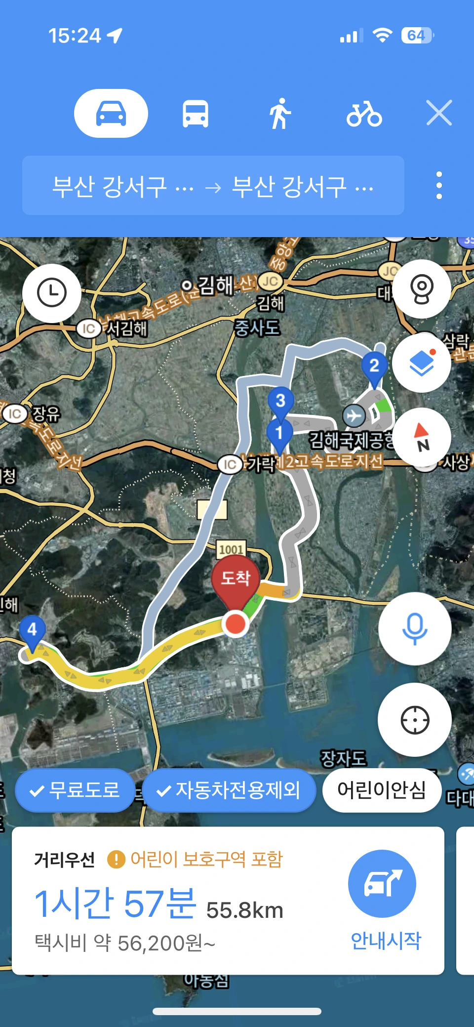 집-(강동중곡슈퍼)-(김해공항)-강서도서관-(강동 119 센터)-(녹산 수문)-(용원휴요양병원)-집