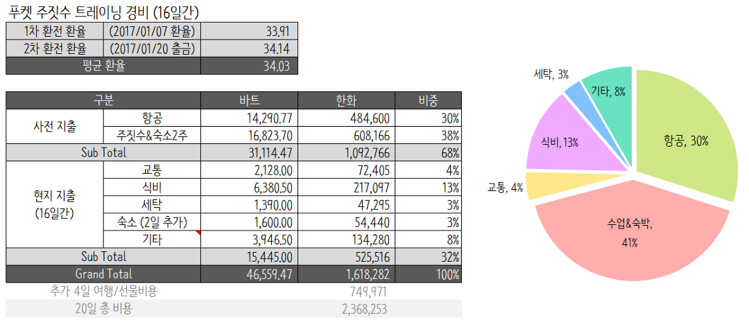생각보다 경비는 많이 들지 않았다. 현지에서 사용한 비용은 트레이닝 기간인 16일 동안 머물면서 쓴 것보다 트레이닝 끝나고 여행하던 4일 동안 쓴 비용이 더 많다. 캠프가 있던 Chalong 지역은 관광지가 아닌지라 물가가 저렴하다. 작은 파인애플 한 통에 20바트(680원). Chalong에서 지낼 때는 1일 1파인애플 하며 지냈다. 트레이닝 끝나고 관광지로 나오니 40바트(1,360원). — 그래도 저렴하긴 하지만 현지 물가에 적응되다 보면 비싸보이더라 — 여하튼 밖으로 나가지 않는 이상 돈 쓸 일은 없다.