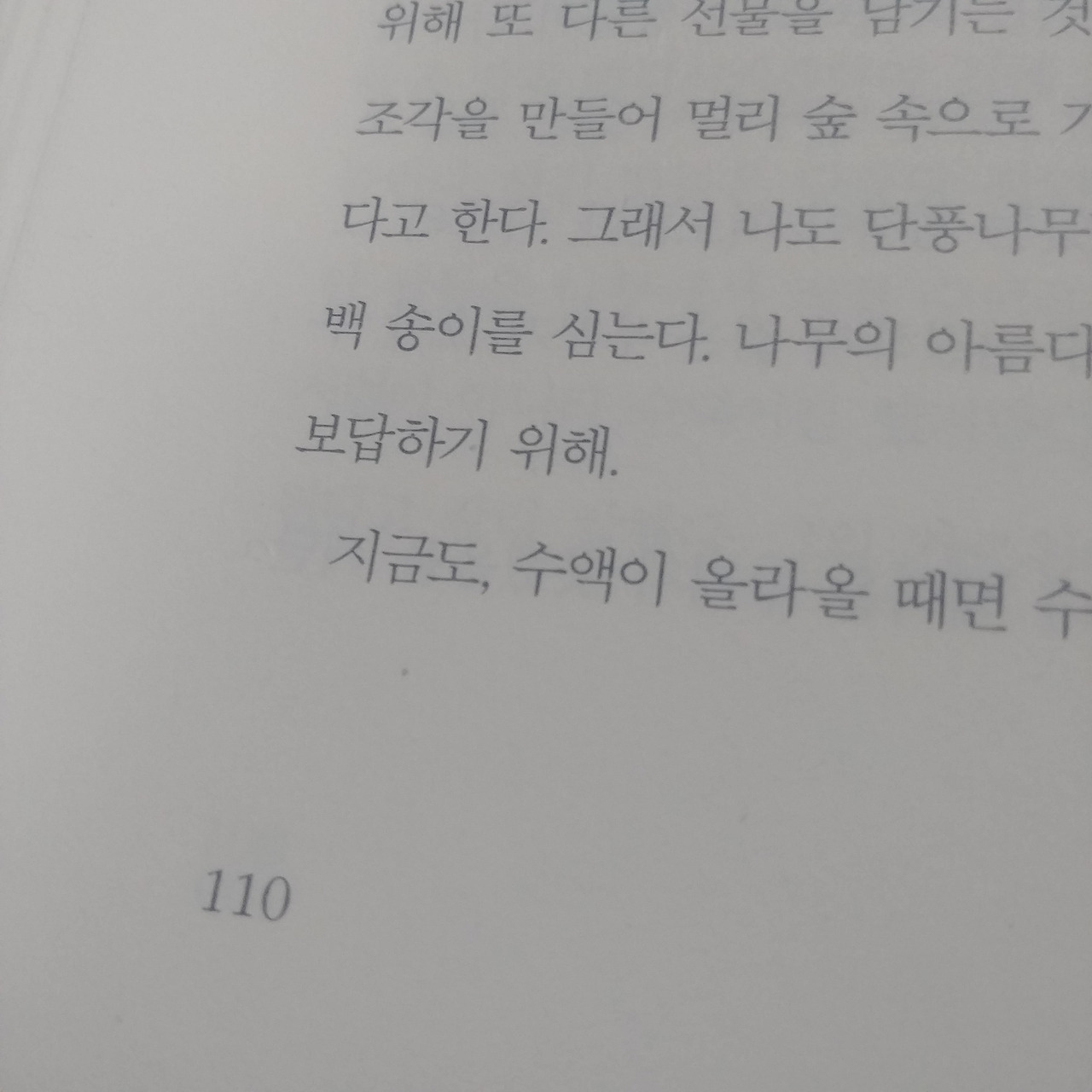 들통이 차면서 온종일 음높이가 달라진다. 마치 유리잔 연주를 듣는 것 같다. 똑똑, 뚝뚝, 딱딱. 수액 방울이 떨어질 때마다 양철 들통과 덮개가 덩달아 울리고 마당이 노래한다. 이것은 홍관조의 멋진 휘파람 소리 못지않은 봄 음악이다. p.103
