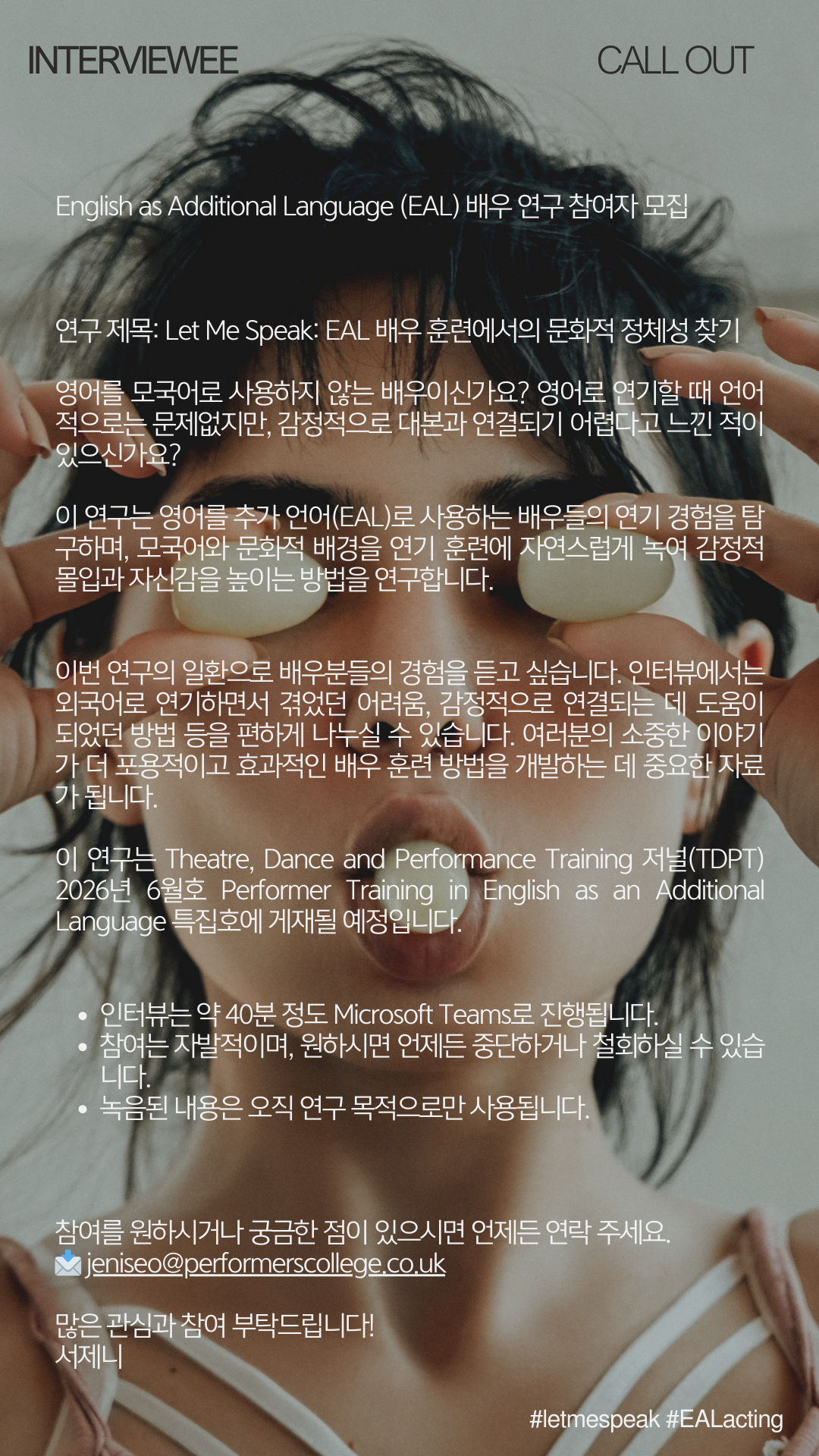 이번 연구의 일환으로 배우분들의 경험을 듣고 싶습니다. 인터뷰에서는 외국어로 연기하면서 겪었던 어려움, 감정적으로 연결되는 데 도움이 되었던 방법 등을 편하게 나누실 수 있습니다. 여러분의 소중한 이야기가 더 포용적이고 효과적인 배우 훈련 방법을 개발하는 데 중요한 자료가 됩니다.
