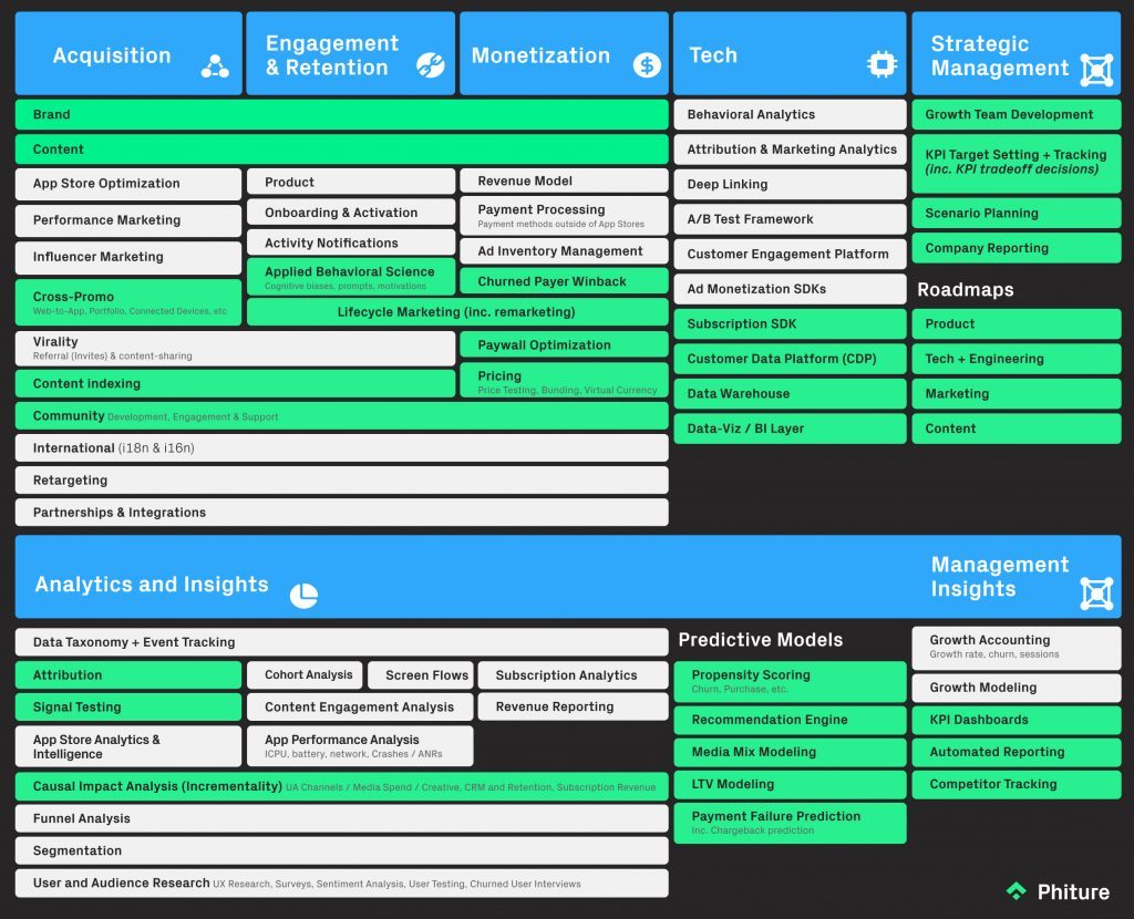 아래는 Phiture에서 만든 Mobile Growth Stack 2022버전이다. 앱 마케팅을 대상으로 만든 마케팅 전반에서 어떤 업무가 있는지 모아둔 표다(나중에 이걸 모바일 게임 마케팅 버전으로 만들어 볼 계획이다).