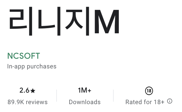 *게임의 다운로드 순위로 리니지 M의 경우 현재 백만 건 이상 5백만 건 이하의 구글플레이를 통한 인스톨이 있었다고 고지하고 있다.