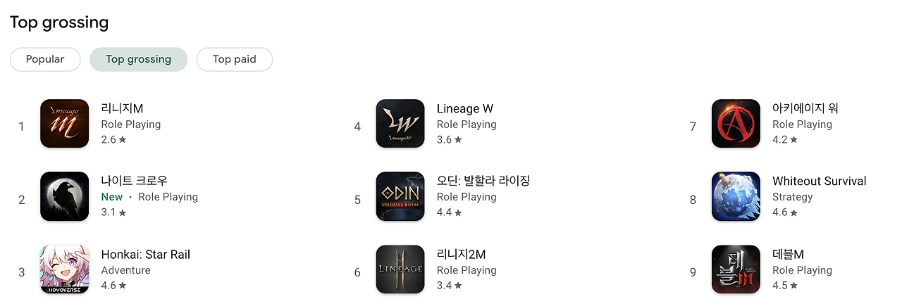 구글플레이와 애플 앱 스토어에서도 다운로드 수를 중심으로 한 인기 순위와 인앱 매출을 통한 매출 순위를 보여주는데 이걸로 해당 게임의 성공 여부를 바로 볼 수 있다.
