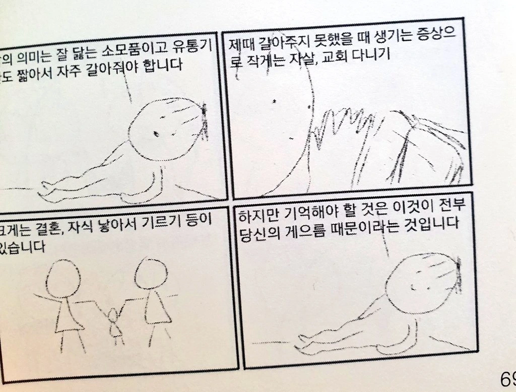 혐규의 만화중 하나다. 삶의 의미는 잘 닿는 소모품이고 유통기한이 짧기 때문에 자주 갈아줘야 한다는 것이다. 물론 가장 좋은 것은 삶의 의미 같은 것을 생각하지 않는 것이다. 하지만 인간으로서 그러기 쉽지 않다. 작가는 삶의 의미를 제때 갈아주지 못하기 때문에 사람들이 '자살, 교회 다니기, 결혼, 자식 낳아서 기르기'등을 한다고 했지만 나는 반대로 그런 것들이 큰 범위에서 삶의 의미를 대체하는데 보통 유용하다고 생각한다. 특히 종교는 '삶의 의미'를 대리하고 위탁하는데 아주 좋다. '애 키우기'가 가장 강력한 삶의 의미 1번인 건 말할 것도 없다. 보통 애는 자기보다 오래 살기 때문에 평생을 삶의 의미라고 생각하면서 살 수 있다.