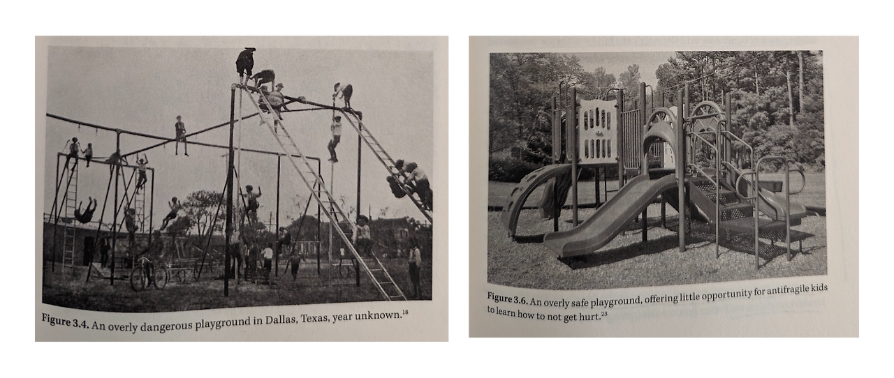 위 사진의 왼쪽은 80년대의 미국 놀이터다. 지금 기준에서는 말도 안 되게 위험해 보인다. 만일 아이가 높은 곳에서 떨어지면 뼈가 부러질 수도 있는 정도의 놀이터가 당시에는 표준이었다. 바로 옆은 2000년대 이후의 놀이터고 말랑하고 안전하게 바뀌었다.지극히 안전하게 설계된 놀이터는 아이들에게 교육적으로 좋지 않다는 게 작가의 주장이다.