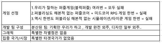 다시 돌아와서 이번글의 주제는 게임 개발의 첫 단계인 '어떤 게임을 만들지'를 정하는 것에 대한 것이다. 첫 게임을 직접 개발하기 전에 여러 번 공동 개발 등에서 실패가 있었다. 우리가 기획을 하고 외주 개발 형태로 퍼즐과 미드코어, 하이브리드 캐주얼 등 여러 게임을 만들었는데 실패의 내용은 아래와 같았다.