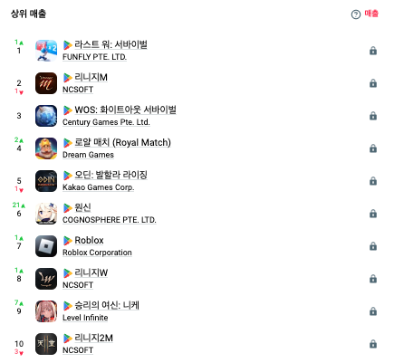 이제 구글플레이 인앱 매출 순위 10위권에서 50%가 외국 게임인데 그중 60%인 3개가 중국게임이다. 1등과 3등이 중국 게임이다.