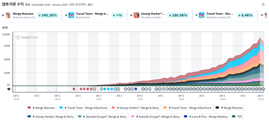 게임 장르 중에 '머지 게임' 장르란 게 있다. 판때기에서 두 개의 기물을 합치는 게 핵심인 캐주얼 게임 장르다. 이 장르는 지속적으로 크고 있고 꽤 큰 시장이다.