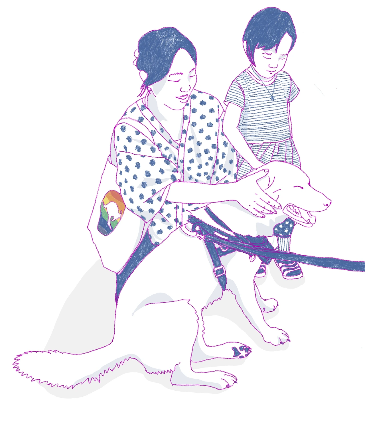 이웃의 강아지가 내 친구와 내 친구의 아이를 아는 체한다.