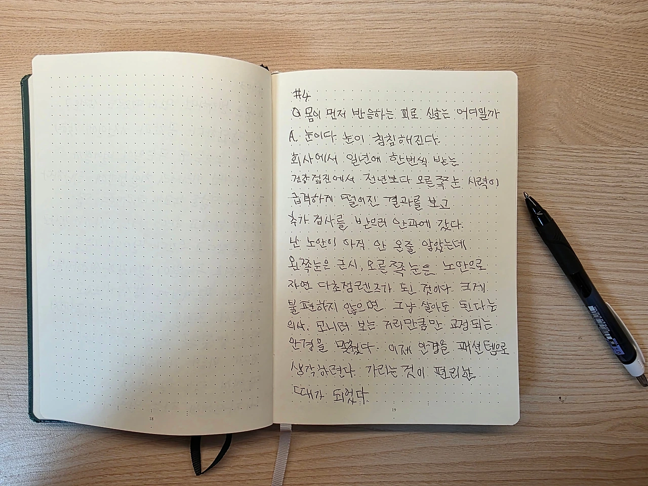 A: 눈이다. 눈이 침침해진다. 회사에서 일 년에 한 번씩 받는 건강검진에서 전년보다 오른쪽 눈 시력이 급격하게 떨어진 결과를 보고 추가 검사를 받으러 안과에 갔다. 난 노안이 아직 안 온 줄 알았는데 왼쪽 눈은 근시, 오른쪽 눈은 노안으로 자연 다초점렌즈가 된 것이다. 크게 불편하지 않으면 그냥 살아도 된다는 의사. 모니터 보는 거리만큼만 교정되는 안경을 맞췄다. 이제 안경을 패션템으로 생각하련다. 가리는 것이 편리한 때가 되었다.