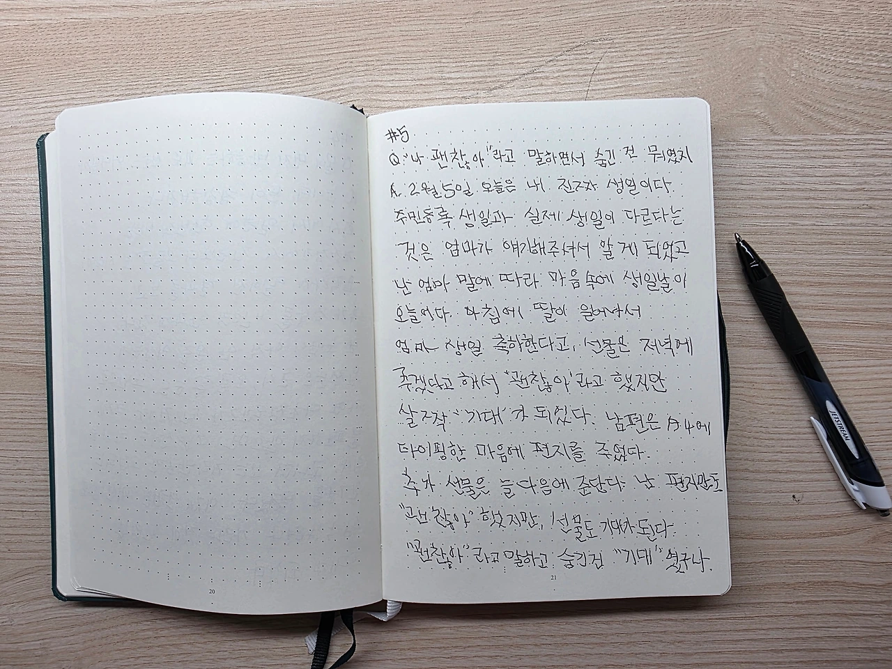 A: 2월 5일 오늘은 내 진짜 생일이다. 주민등록 생일과 실제 생일이 다르다는 것은 엄마가 얘기해주셔서 알게 되었고 난 엄마 말에 따라 마음 속에 생일날이 오늘이다. 아침에 딸이 일어나서 엄마 생일 축하한다고, 선물은 저녁에 주겠다고 해서 "괜찮아"라고 했지만 살짝 '기대'가 되었다. 남편은 A4에 타이핑한 마음의 편지를 주었다. 추가 선물은 늘 다음에 준단다. 난 편지만도 "괜찮아"했지만, 선물도 기대가 된다. "괜찮아"라고 말하고 숨긴건 "기대"였구나.