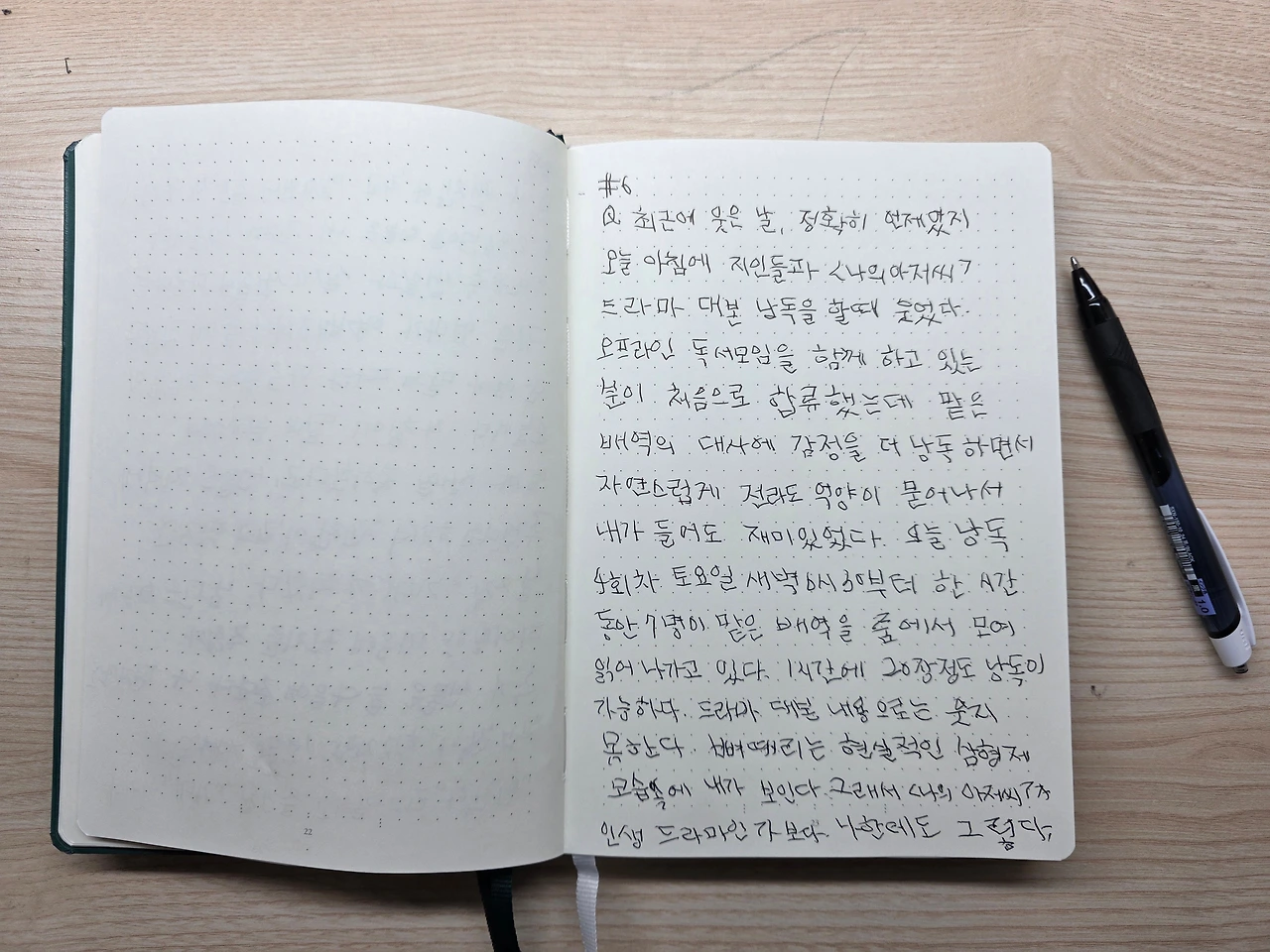 A: 오늘 아침에 지인들과 <나의 아저씨> 드라마 대본 낭독을 할 때 웃었다. 오프라인 독서 모임을 함께 하고 있는 분이 처음으로 합류했는데 맡은 배역의 대사에 감정을 더해 낭독하면서 자연스럽게 전라도 억양이 묻어나서 내가 들어도 재미있었다. 오늘 낭독 4회 차 토요일 새벽 6시 30부터 한 시간 동안 7명이 맡은 배역을 줌에서 모여 읽어 나가고 있다. 1시간에 20장 정도 낭독이 가능하다. 드라마 대본 내용으로는 웃지 못한다. 뼈 때리는 현실적인 삼 형제 모습 속에 내가 보인다. 그래서 <나의 아저씨>가 인생 드라마인가 보다. 나한테도 그렇다.