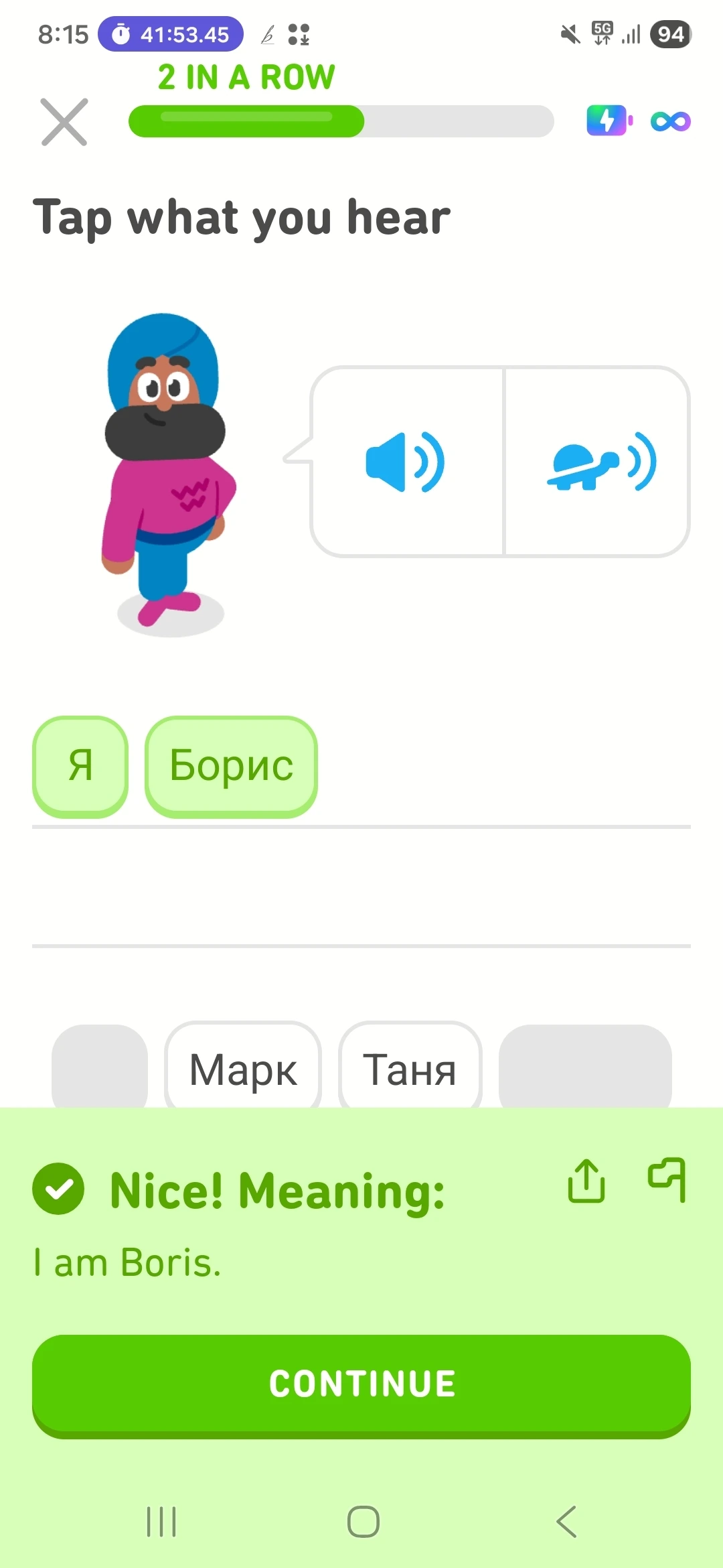 퇴근 후, 듀오링고와 씨름하며 러시아어를 배운다.